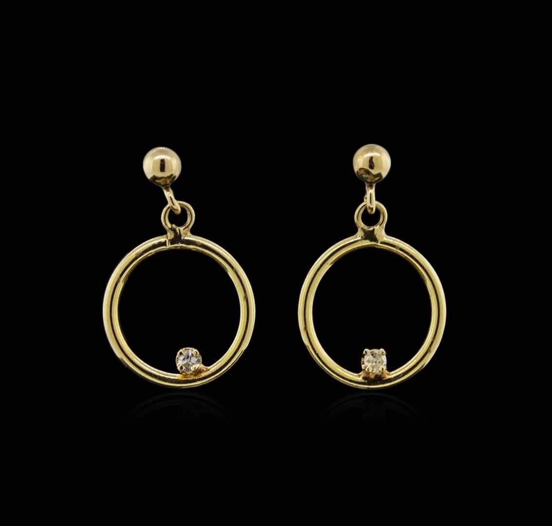 One pair of earrings featuring: 14KT yellow gold weighing 0.87 grams containing two prong set round diamonds with a total weight of 0.03ct.