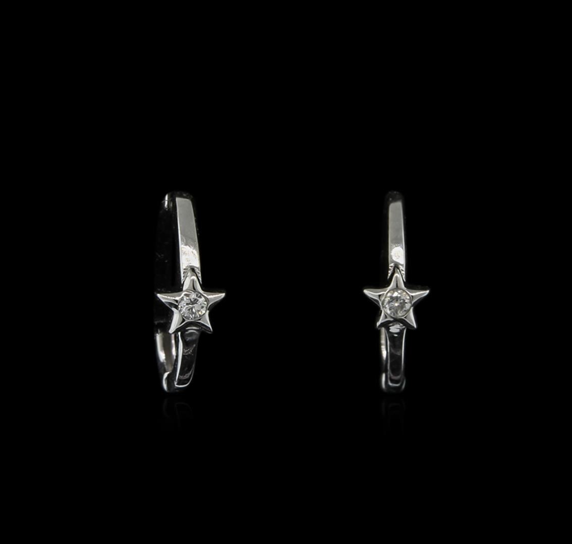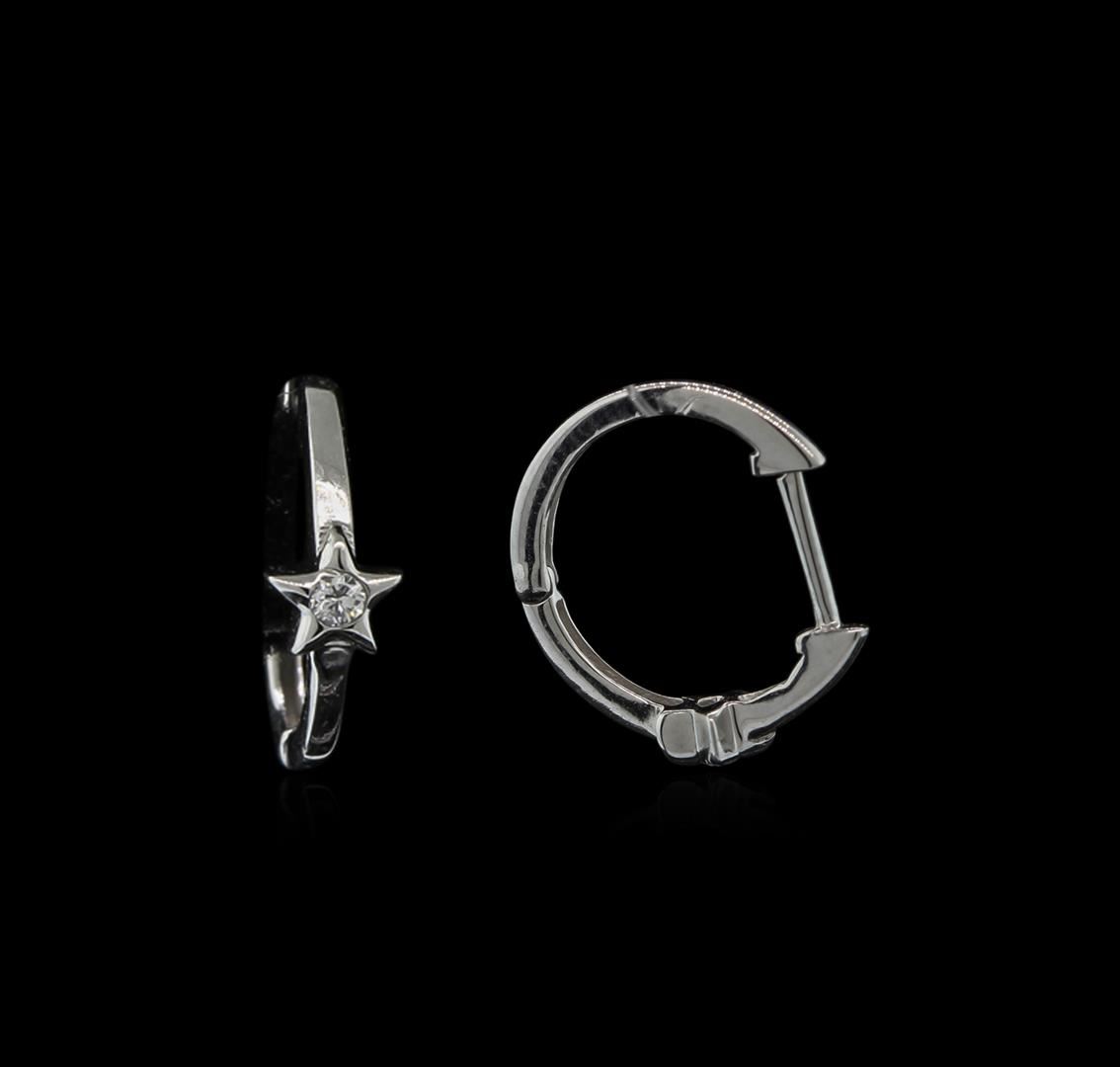 One pair of tiny hoop earrings featuring: 14KT white gold weighing 1.11 grams containing bezel set round diamonds with a total weight of 0.03ct.