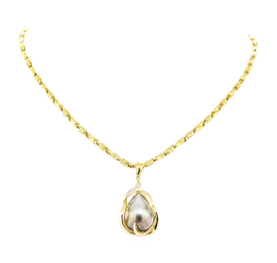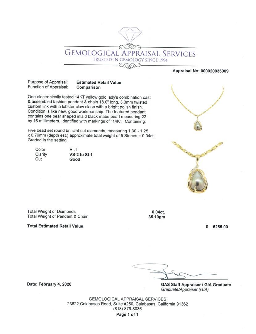 One electronically tested 14KT yellow gold lady's combination cast & assembled fashion pendant & chain 18.0' long, 3.3mm twisted custom link with a lobster claw clasp with a bright polish finish. The featured pendant contains one pear shaped inlaid black mabe pearl measuring 22 by 16 millimeters. Identified with markings of '14K'. Condition is like new, good workmanship. Containing: Five bead set round brilliant cut diamonds, measuring 1.30 - 1.25 x 0.79mm (depth est.) approximate total weight of 5 Stones = 0.04ct. Graded in the setting. Color H - I Clarity VS-2 to SI-1 Cut Good. Total Weight of Diamonds 0.04ct.. Total Weight of Pendant & Chain 35.10gm GAS Appraised at $5255.00. GAS Appraised.