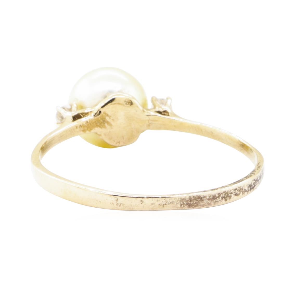 One pearl ring featuring: 10KT yellow gold weighing 1.8 grams containing one pearl measuring 7.5mm flanked by two diamonds weighing 0.04ctw.