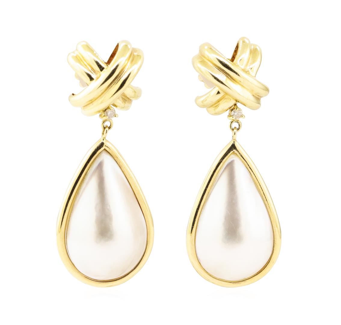 One pair of earrings with a drop of approximately 41 millimeters featuring: 14KT yellow gold weighing 12.2 grams containing diamonds weighing 0.08ctw and two pear shaped mother of pearl pieces.