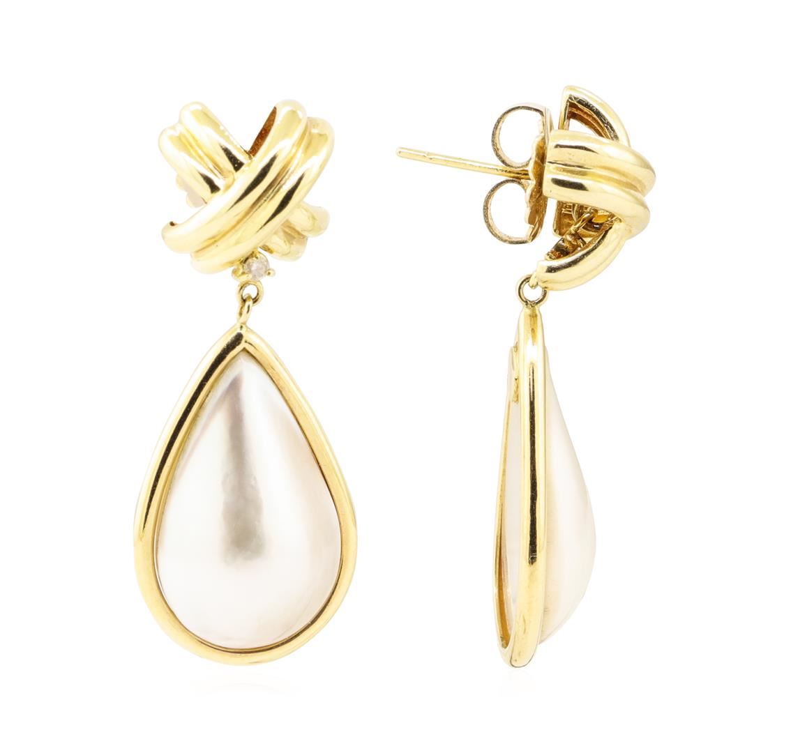 One pair of earrings with a drop of approximately 41 millimeters featuring: 14KT yellow gold weighing 12.2 grams containing diamonds weighing 0.08ctw and two pear shaped mother of pearl pieces.