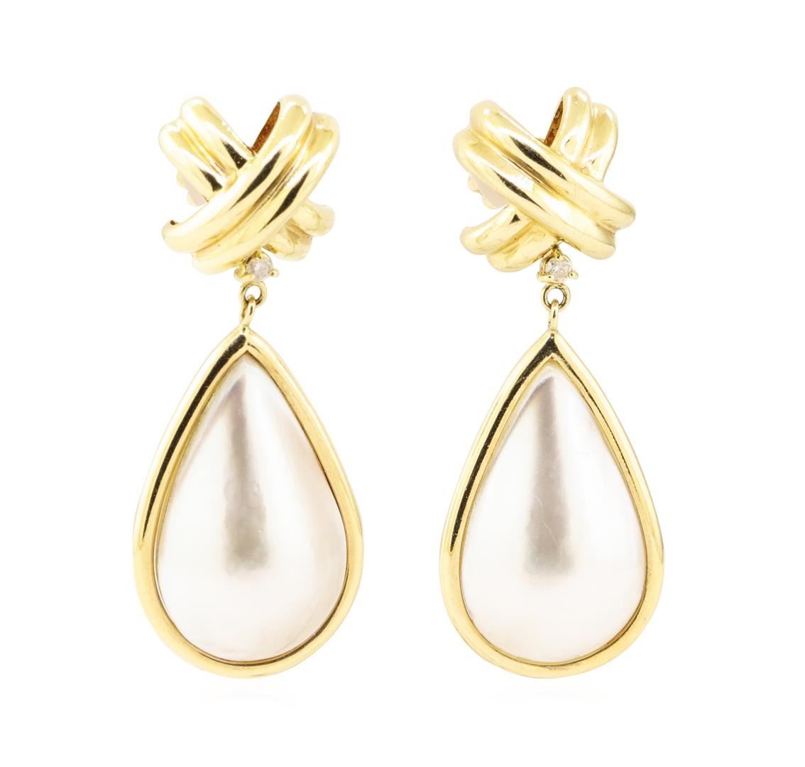 One pair of earrings with a drop of approximately 41 millimeters featuring: 14KT yellow gold weighing 12.2 grams containing diamonds weighing 0.08ctw and two pear shaped mother of pearl pieces.