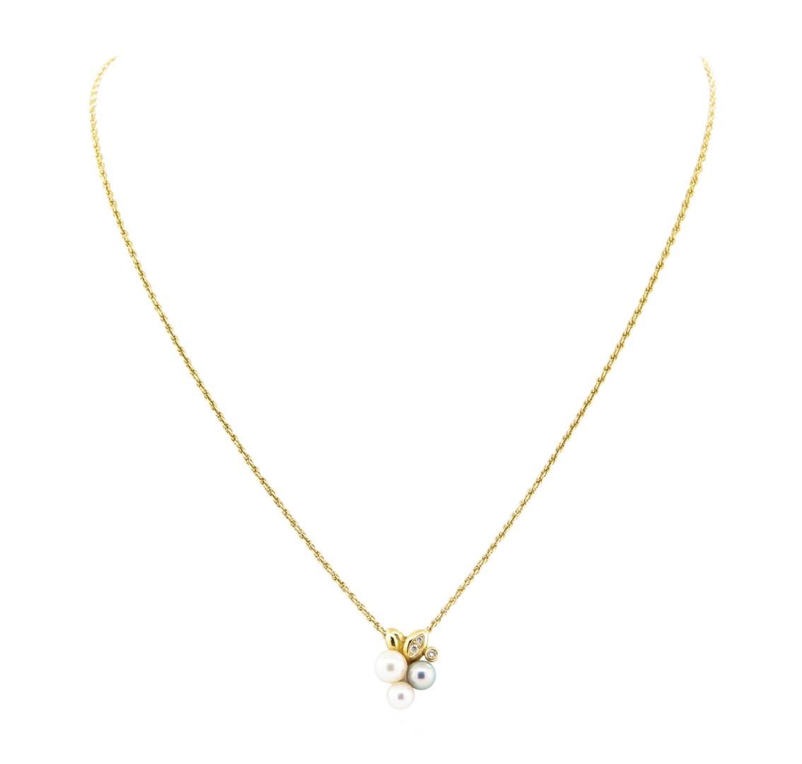 One diamond and pearl pendant with an attached nineteen inch rope chain featuring: 18KT yellow gold weighing 8.0 grams containing three pearls measuring between 7mm and 5.5mm, and diamonds weighing 0.08ctw.
