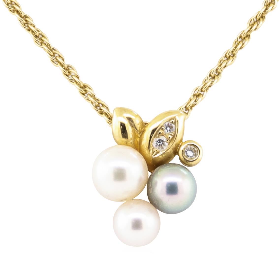 One diamond and pearl pendant with an attached nineteen inch rope chain featuring: 18KT yellow gold weighing 8.0 grams containing three pearls measuring between 7mm and 5.5mm, and diamonds weighing 0.08ctw.