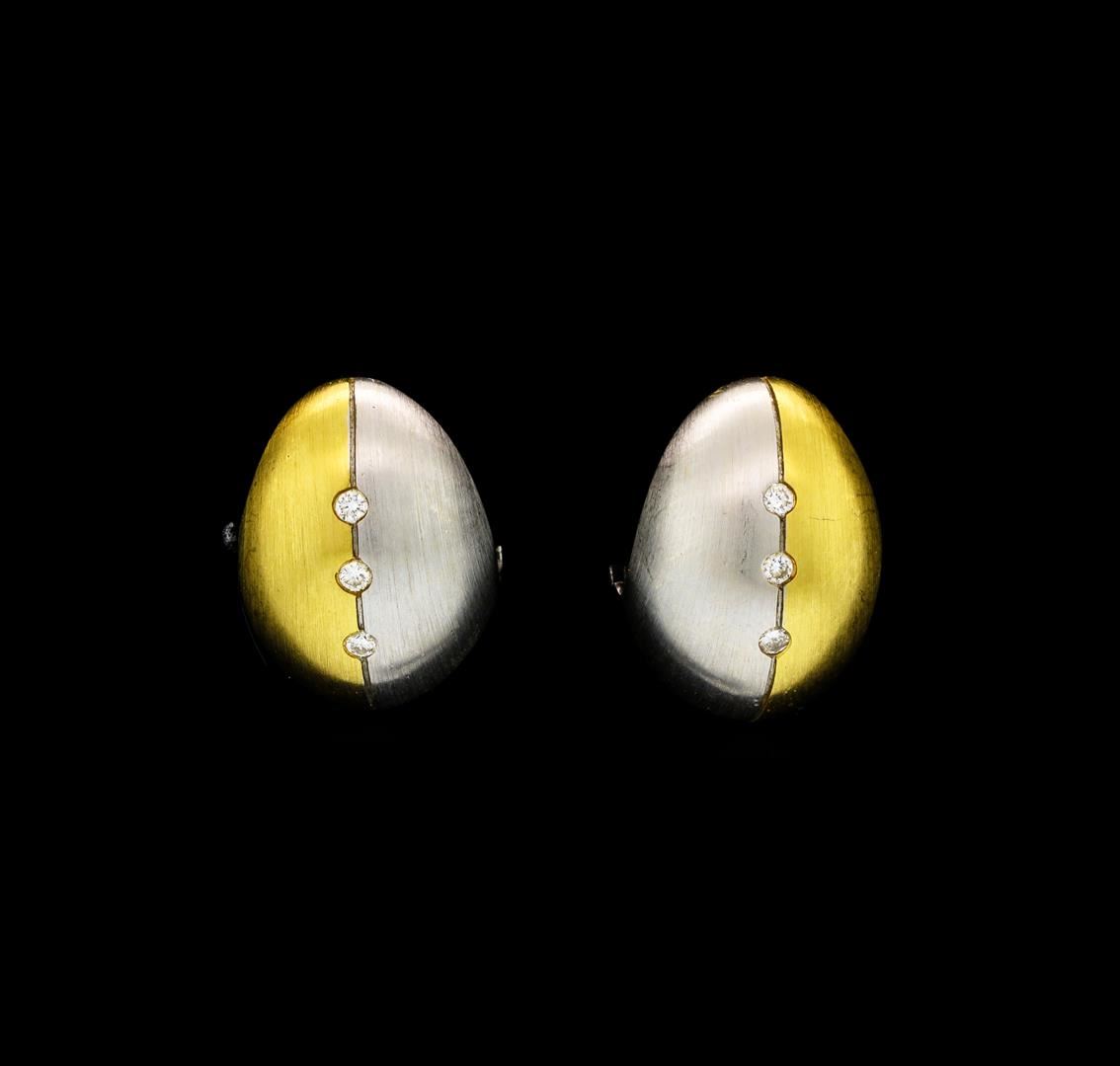 One pair of huggie earrings featuring: 18KT two tone gold weighing 11.93 grams containing diamonds weighing 0.10ctw.