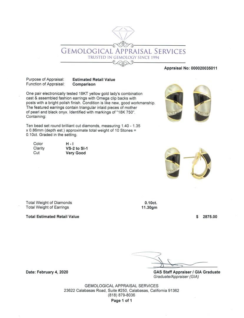 One pair electronically tested 18KT yellow gold lady's combination cast & assembled fashion earrings with Omega clip backs with posts with a bright polish finish. The featured earrings contain triangular inlaid pieces of mother of pearl and black onyx. Identified with markings of '18K 750'. Condition is like new, good workmanship. Containing: Ten bead set round brilliant cut diamonds, measuring 1.40 - 1.35 x 0.86mm (depth est.) approximate total weight of 10 Stones = 0.10 ct. Graded in the setting. Color H - I Clarity VS-2 to SI-1 Cut Very Good. Total Weight of Diamonds 0.10 ct.. Total Weight of Earrings 11.30gm GAS Appraised at $2875.00. GAS Appraised.