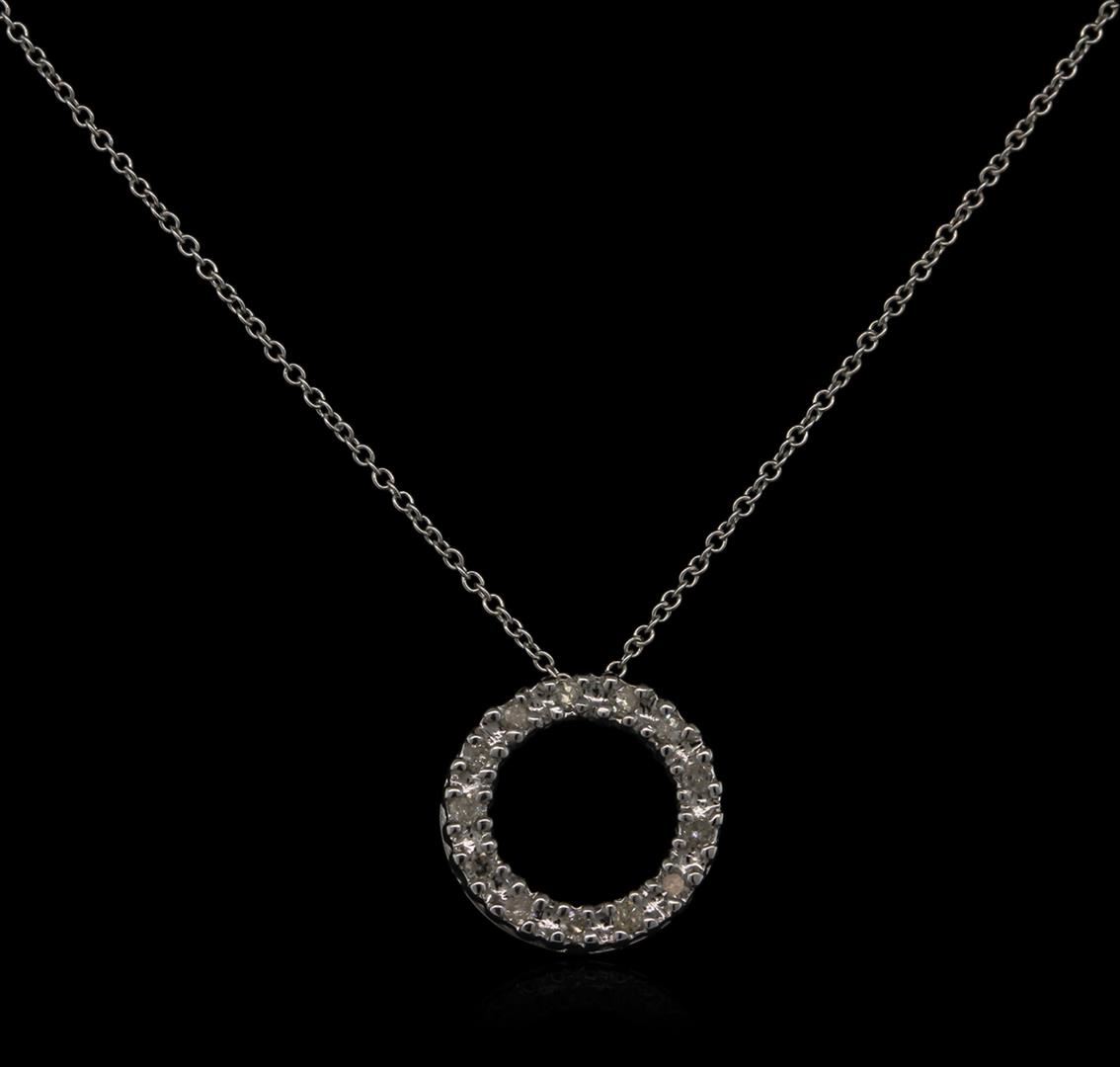 One circle pendant with chain featuring: 10KT white gold weighing 1.75 grams containing prong set round diamonds with a total weight of 0.10ct.