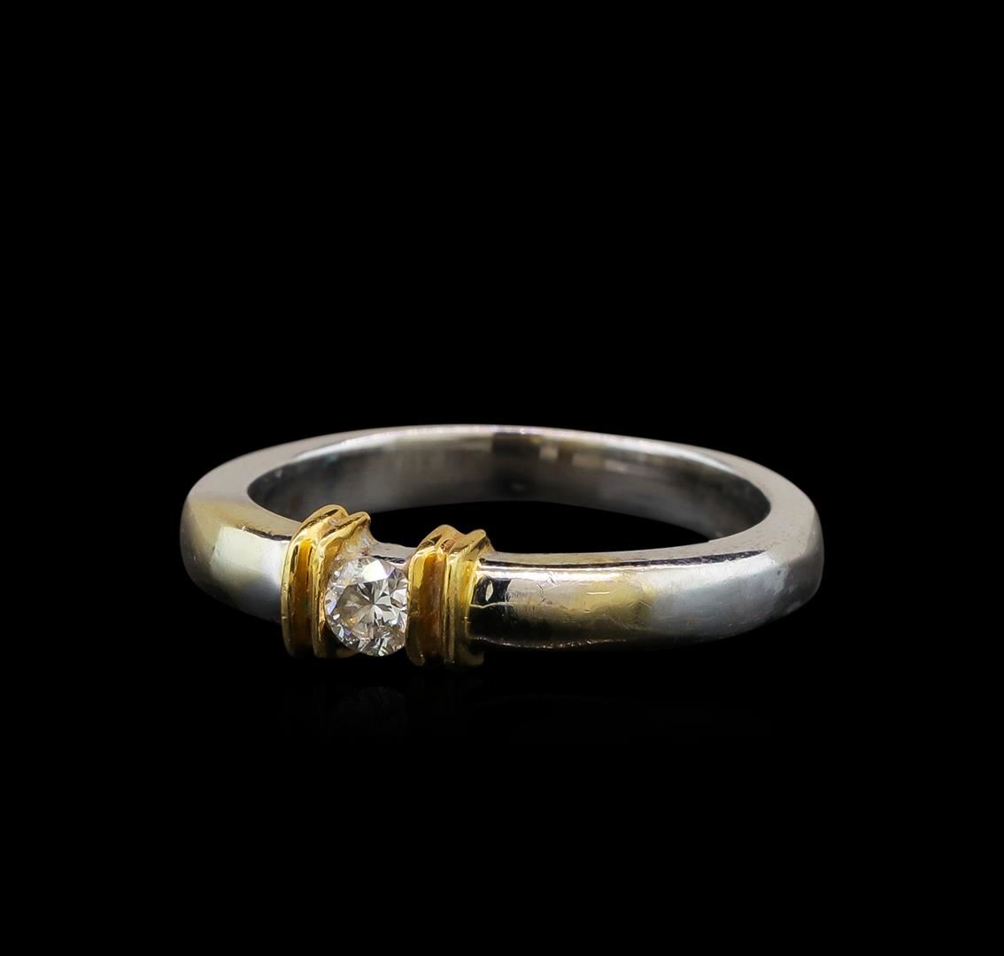 One electronically tested 14KT white gold ladies cast diamond solitaire ring. The featured diamond is set between mirroring yellow gold accented vertical ribbons, completed by a two and one-half millimeter wide band. Identified with markings of '14K'. Condition is good. Containing: One prong set round brilliant cut diamond, measuring 3.00 - 3.00 x 1.80mm (depth est.) approximate weight of 0.11ct. Graded in the setting. Clarity I-1. Color: J Depth 60.0%. Table: 63.3%.. Total Weight of Diamonds 0.11ct.. Total Weight of Ring 3.41gm. AIG Appraised at $900.00.