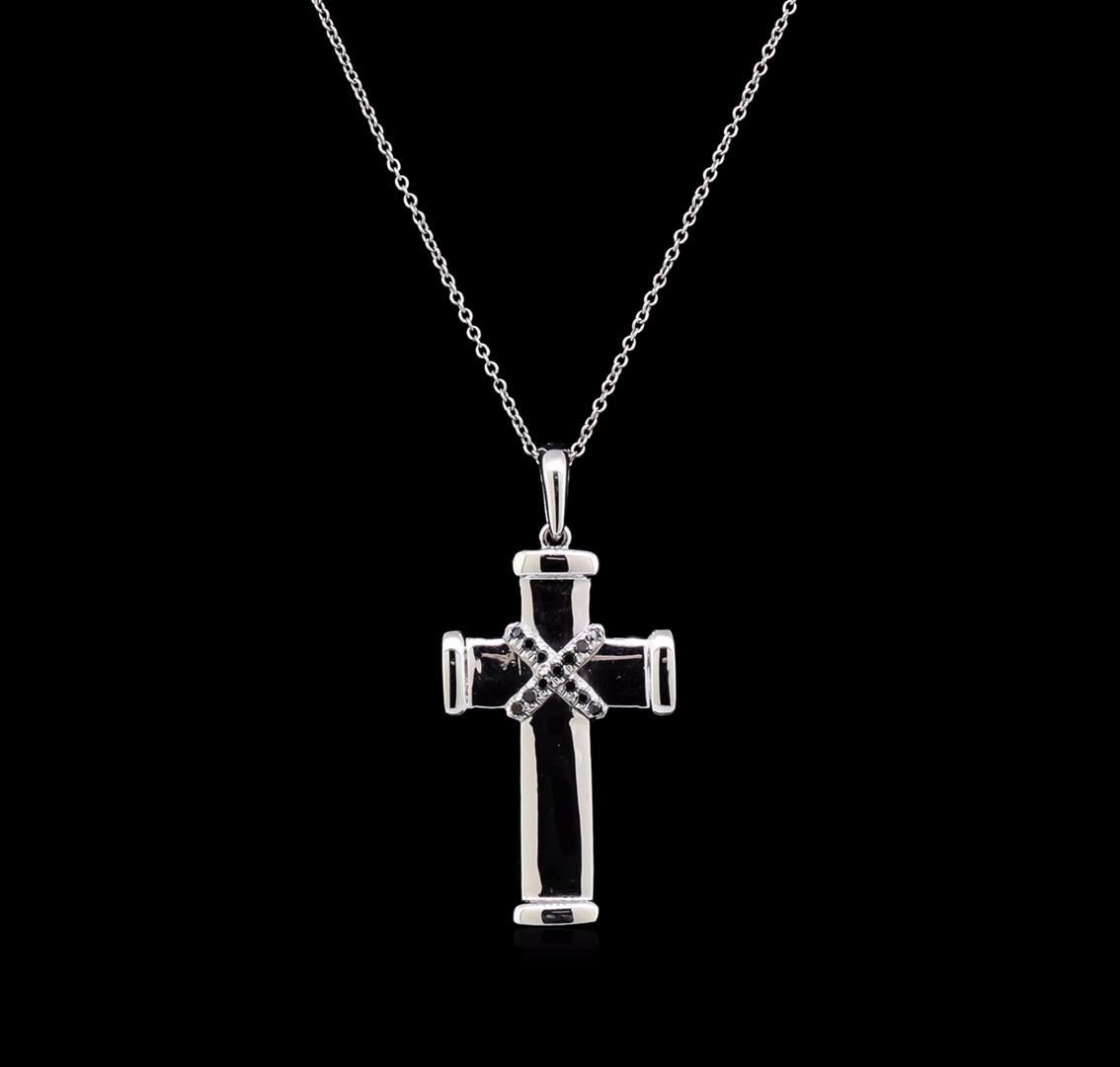 One cross pendant with chain featuring: 14KT white gold weighing 5.04 grams containing black diamonds with a total weight of 0.12ct.