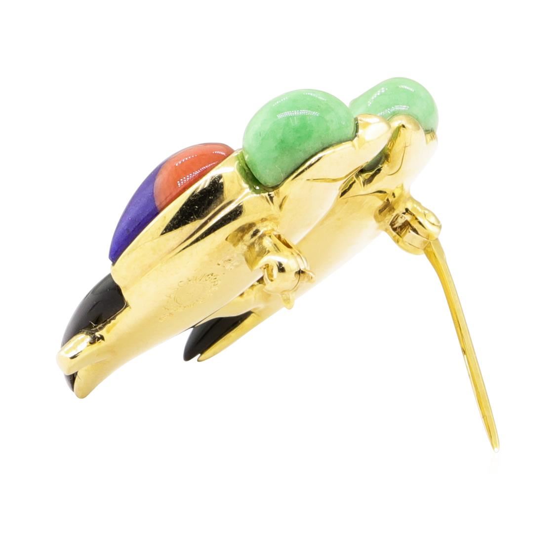 One electronically tested 14KT yellow gold lady's combination cast & assembled fashion designer lovebird pin with a bright polish finish. The featured lady's pin contains inlaid pieces of mother of pearl, lapis, black onyx, jade, and coral. Trademark is Asch-Grossbardt. Identified with markings of '14K'. Condition is new, good workmanship. Containing: Two bezel set round brilliant cut diamonds, measuring 1.90 - 1.85 x 1.17mm (depth est.) approximate total weight of 2 Stones = 0.05ct. Graded in the setting. Color G - H Clarity VS-1 to VS-2 Cut Very Good Six bead set round brilliant cut diamonds, measuring 1.50 - 1.45 x 0.92mm (depth est.) approximate total weight of 6 Stones = 0.07ct. Graded in the setting. Color G - H Clarity VS-1 to VS-2 Cut Very Good. Total Weight of Diamonds 0.12ct.. Total Weight of Lovebird Pin 9.20gm GAS Appraised at $3200.00. GAS Appraised.
