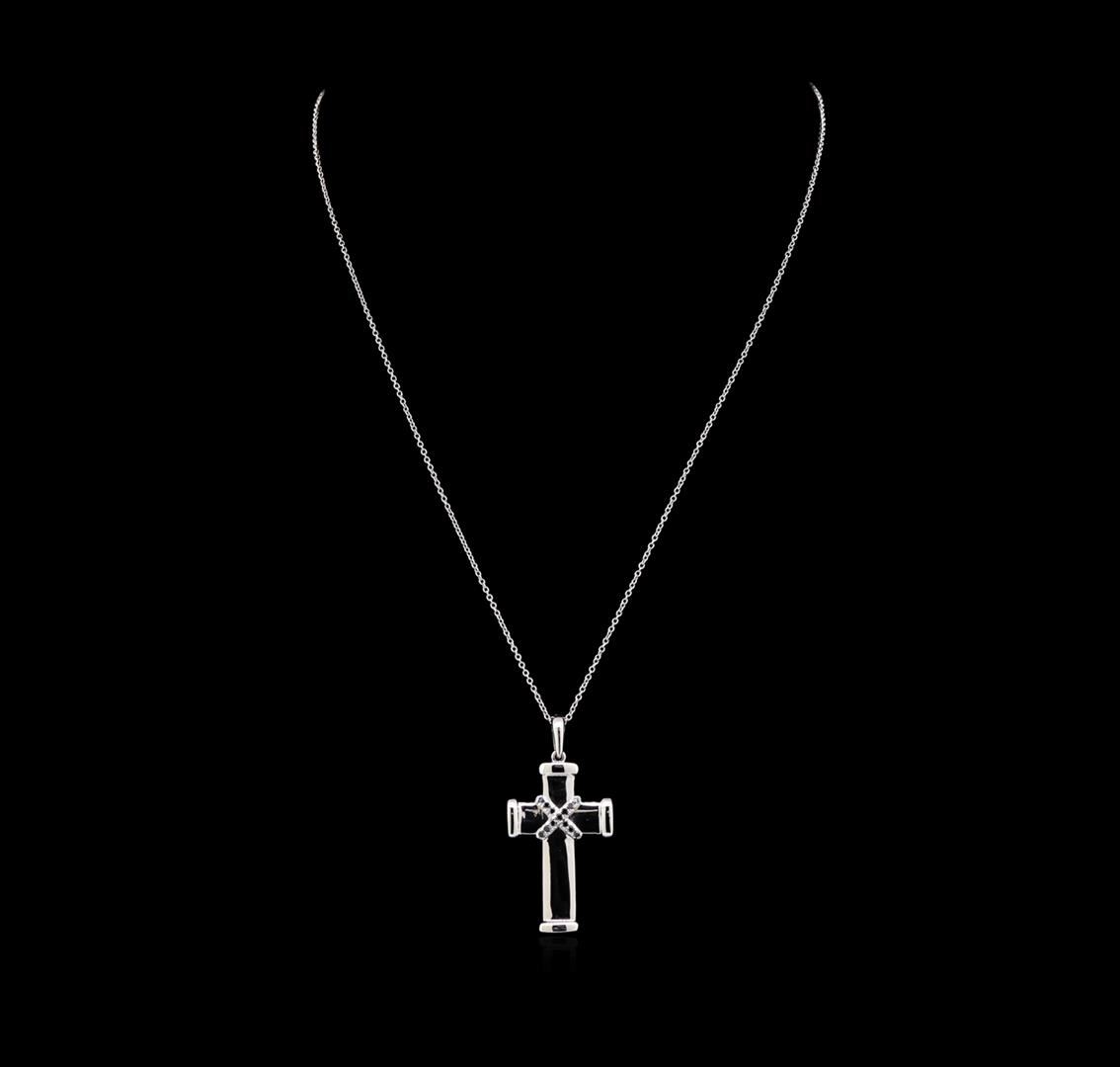 One cross pendant with chain featuring: 14KT white gold weighing 5.04 grams containing black diamonds with a total weight of 0.12ct.