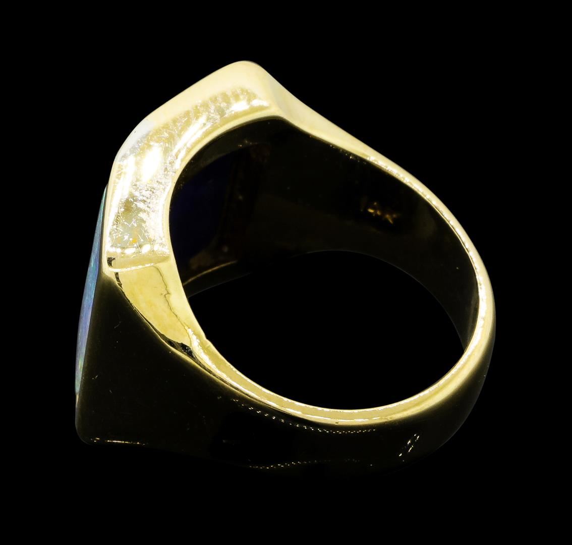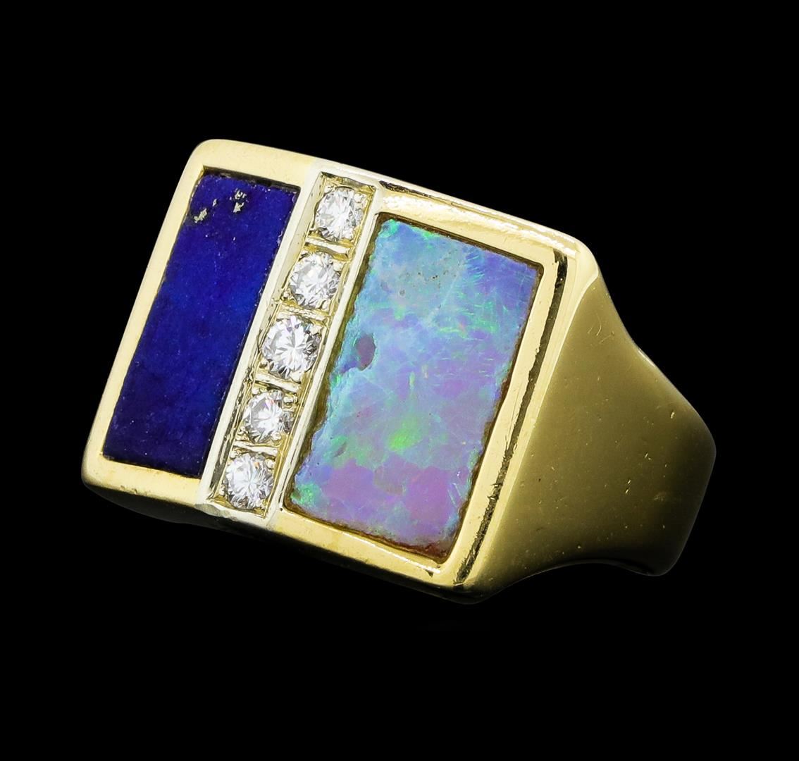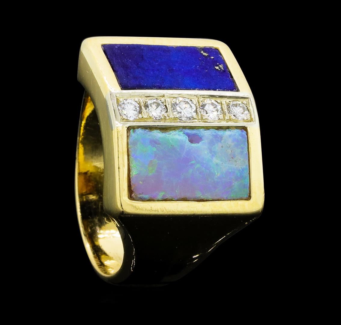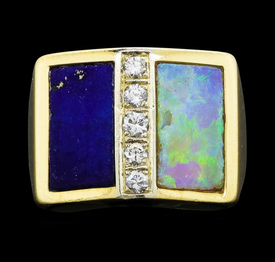 One lady's ring featuring: 14KT yellow gold weighing 9.8 grams containing diamonds weighing 0.15ctw, one piece of inlaid opal and one piece of inlaid lapis lazuli.