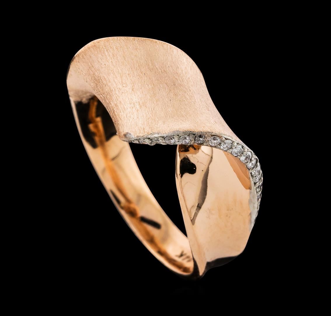 One Diamond Ring featuring: 14KT Rose Gold with a total weight of 6.75 grams and 21 Diamonds with a total weight of 0.15ctw.
