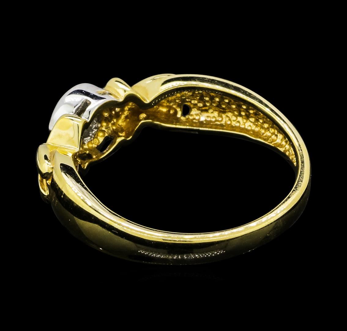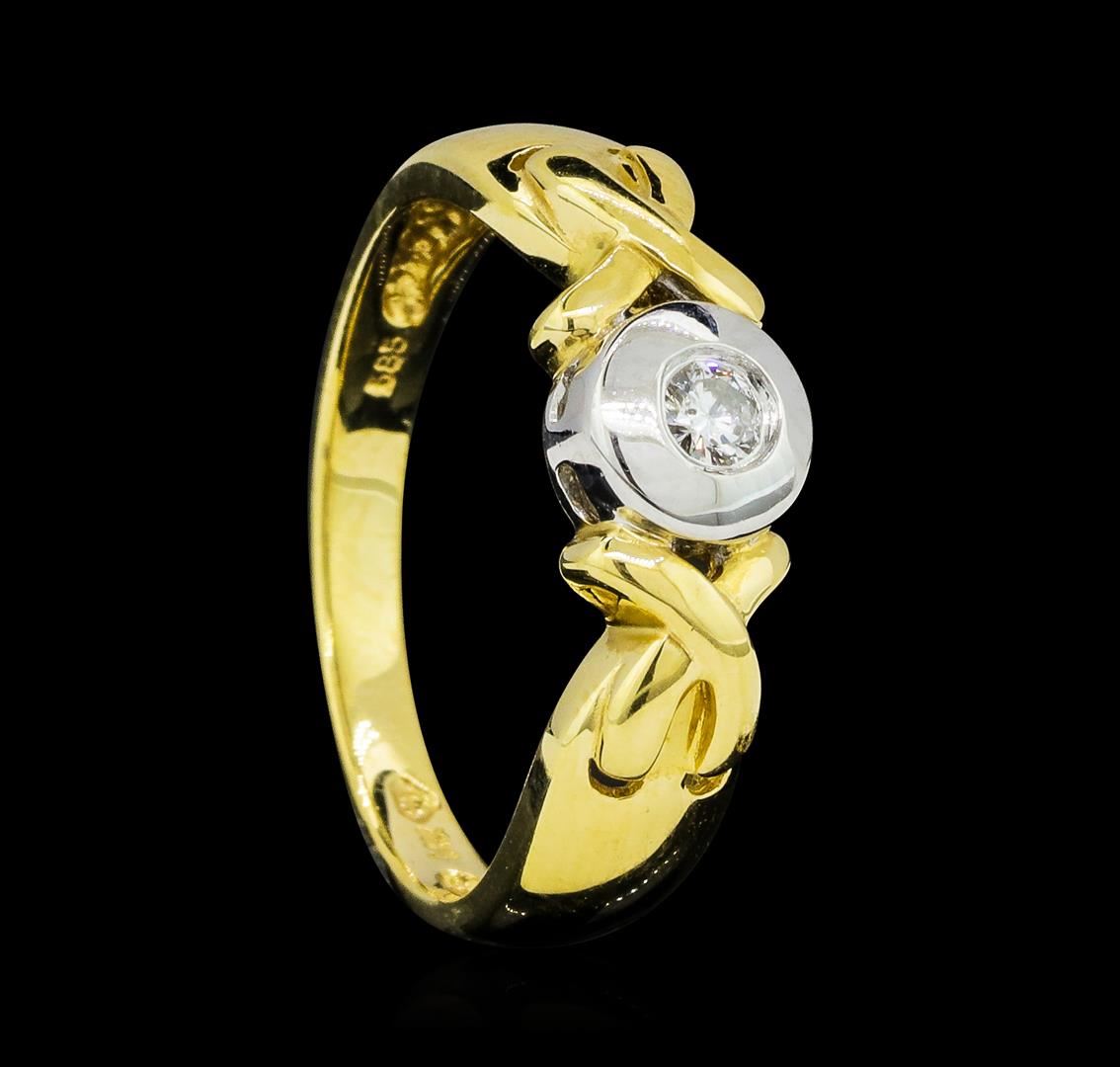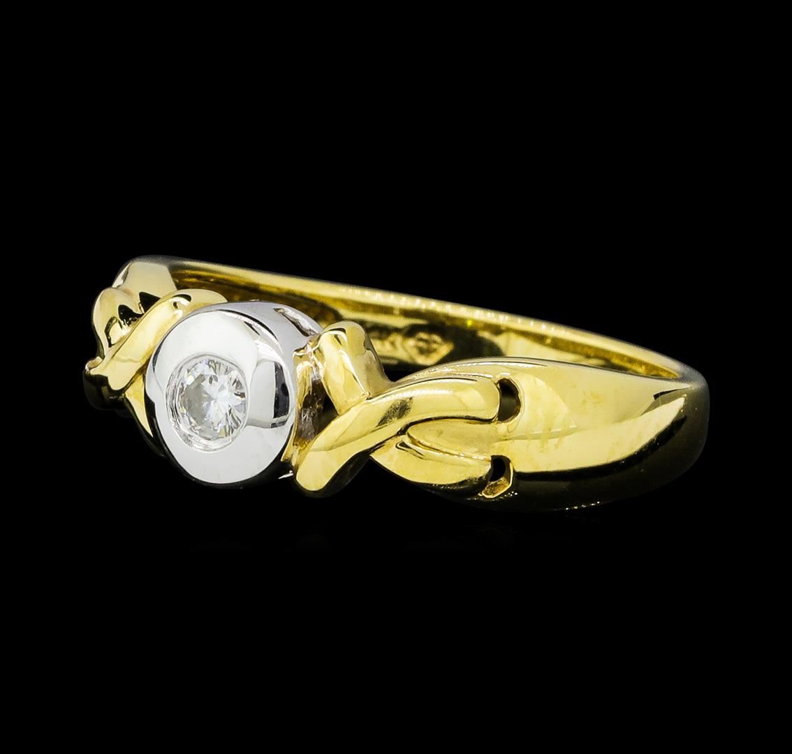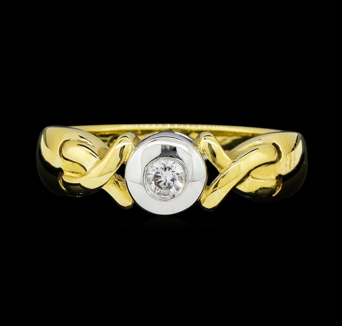 One lady's ring featuring: 14KT yellow gold with rhodium plating weighing 3.4 grams containing one diamond weighing 0.15ct.