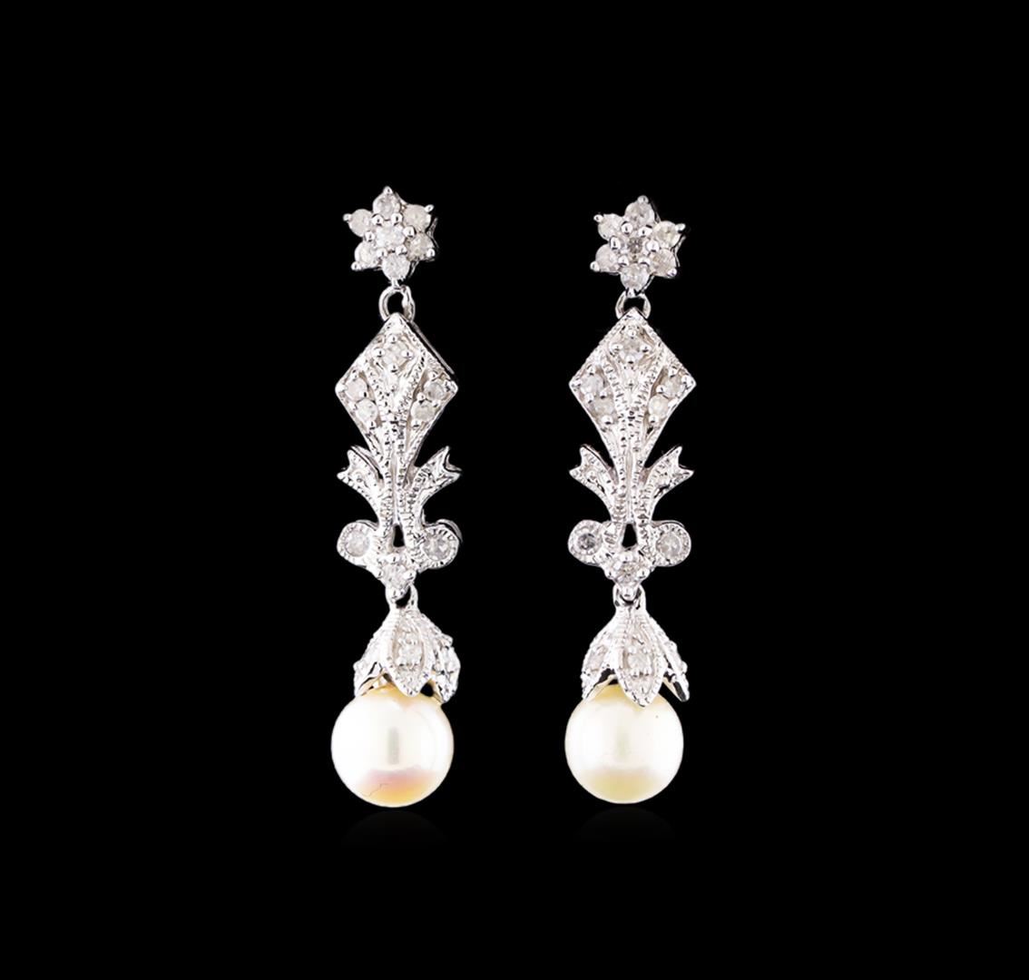 One pair of dangle earrings featuring: 14KT white gold weighing 3.75 grams containing two pearls and diamonds weighing 0.15ctw.