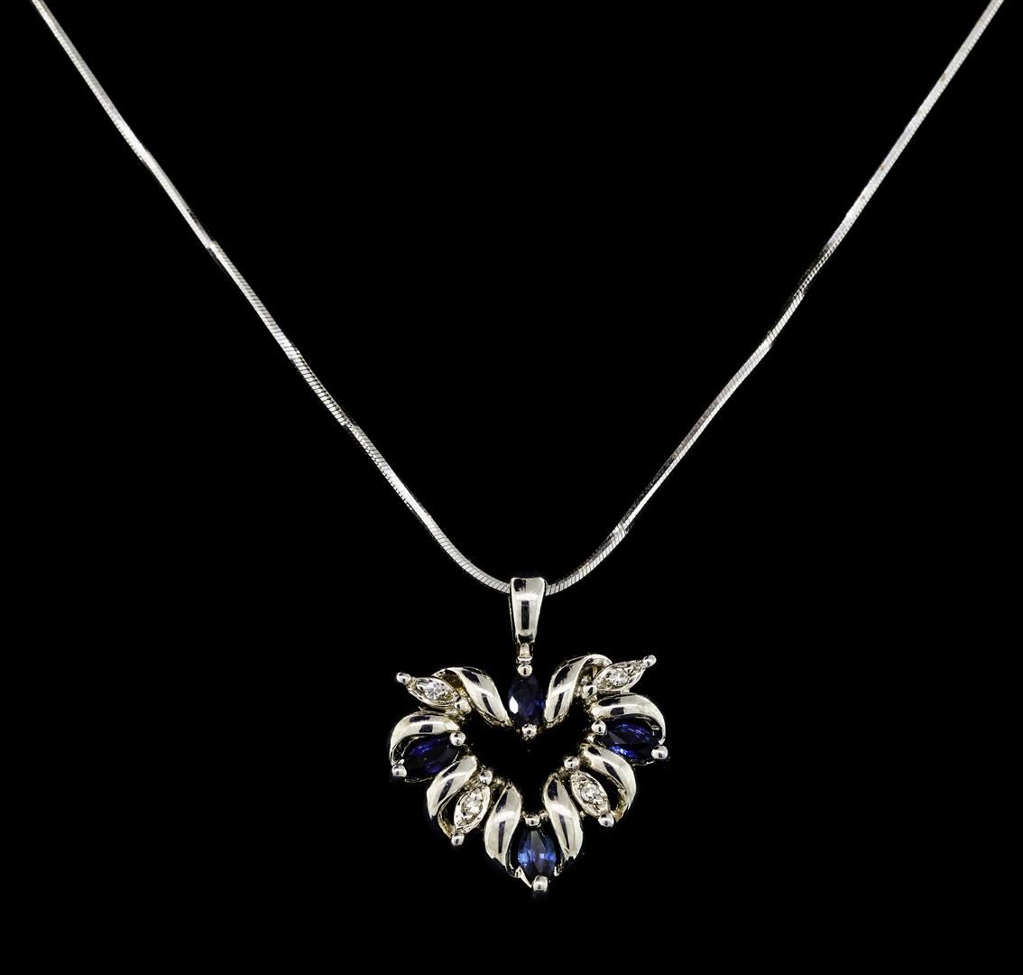 One lady's pendant with chain featuring: 14KT white gold weighing 4.1 grams containing sapphires weighing 0.15ctw and diamonds weighing 0.05ctw. The pendant has a chain measuring approximately eighteen inches in length.