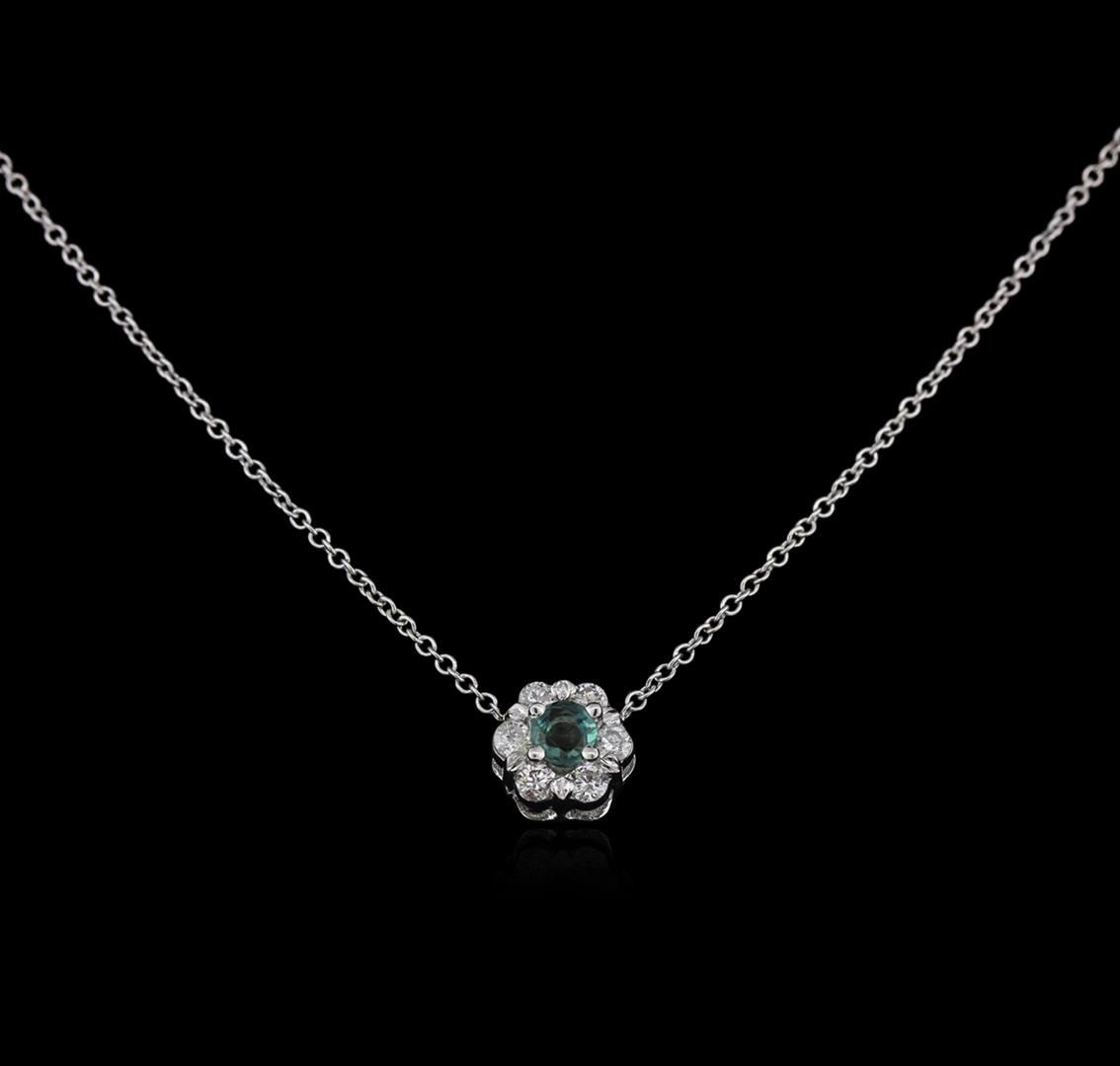 One pendant with chain featuring: 14KT white gold weighing 2.36 grams containing one prong set round emerald center stone with a total weight of 0.15ct and prong set round diamonds with a total weight of 0.30ct.