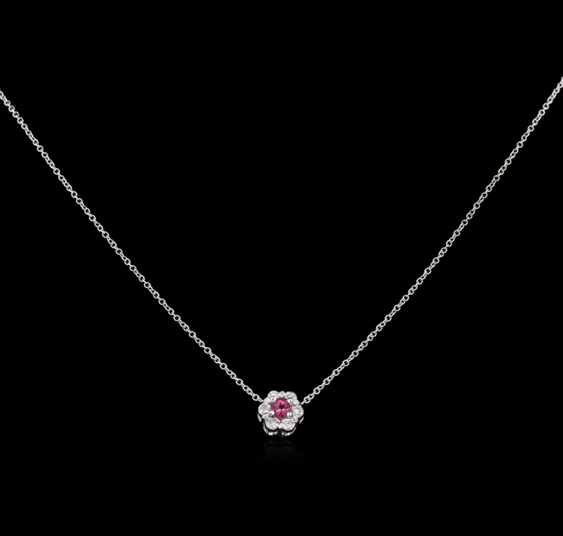 One pendant with chain featuring: 14KT white gold weighing 2.34 grams containing one prong set round rubellite center stone with a total weight of 0.15ct and prong set round diamonds with a total weight of 0.30ct.