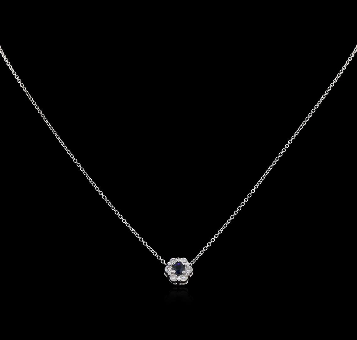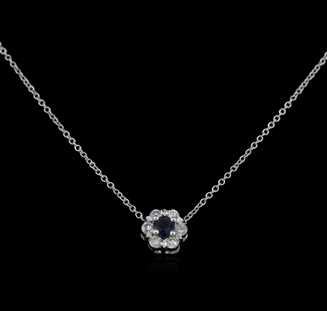 One pendant with chain featuring: 14KT white gold weighing 2.37 grams containing one prong set round blue sapphire center stone with a total weight of 0.15ct and prong set round diamonds with a total weight of 0.30ct.