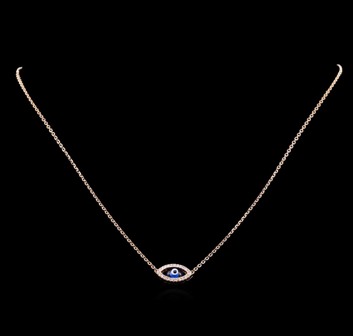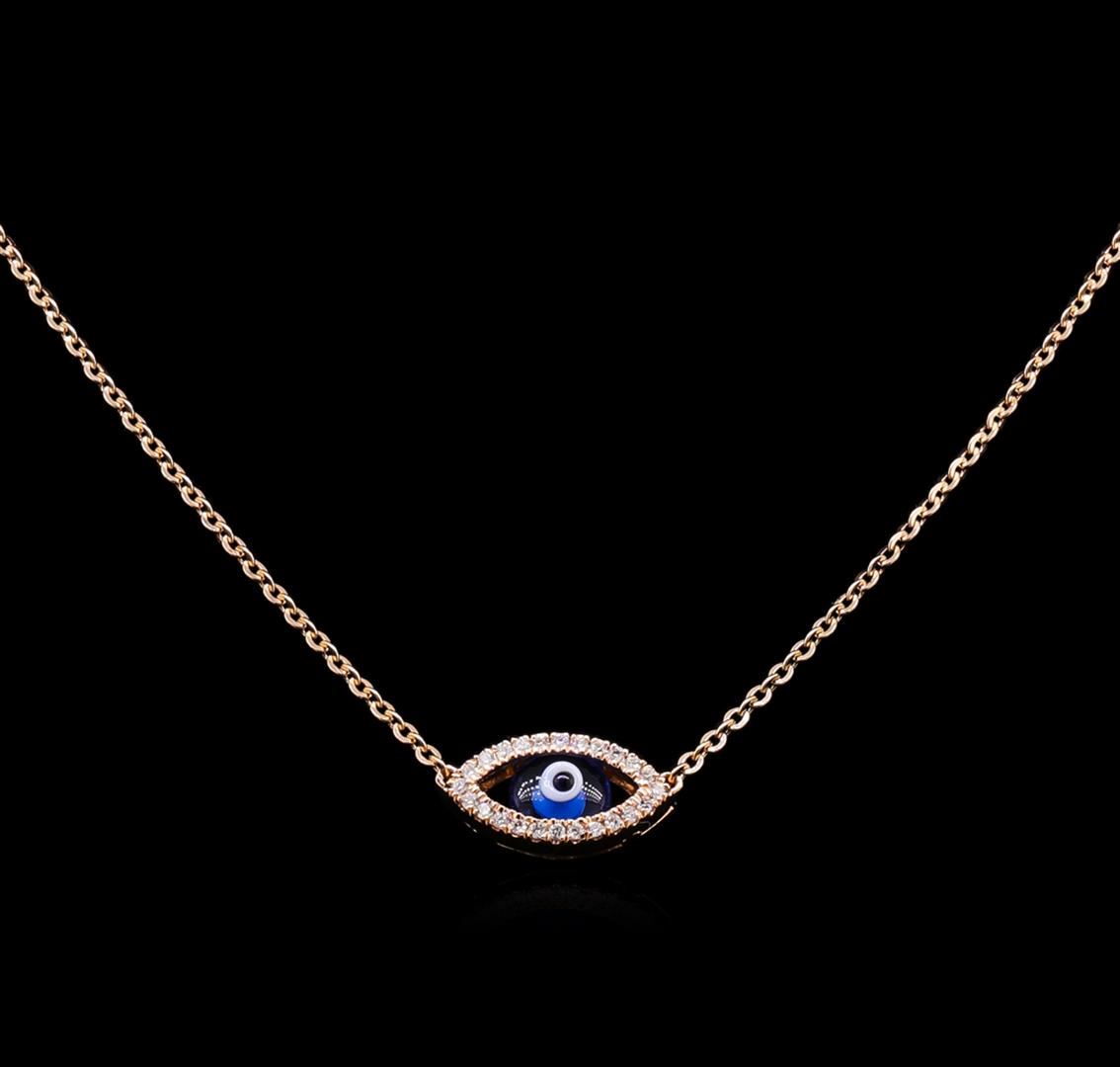 One evil eye necklace featuring: 14KT rose gold weighing 3.62 grams containing diamonds with a total weight of 0.15ct.