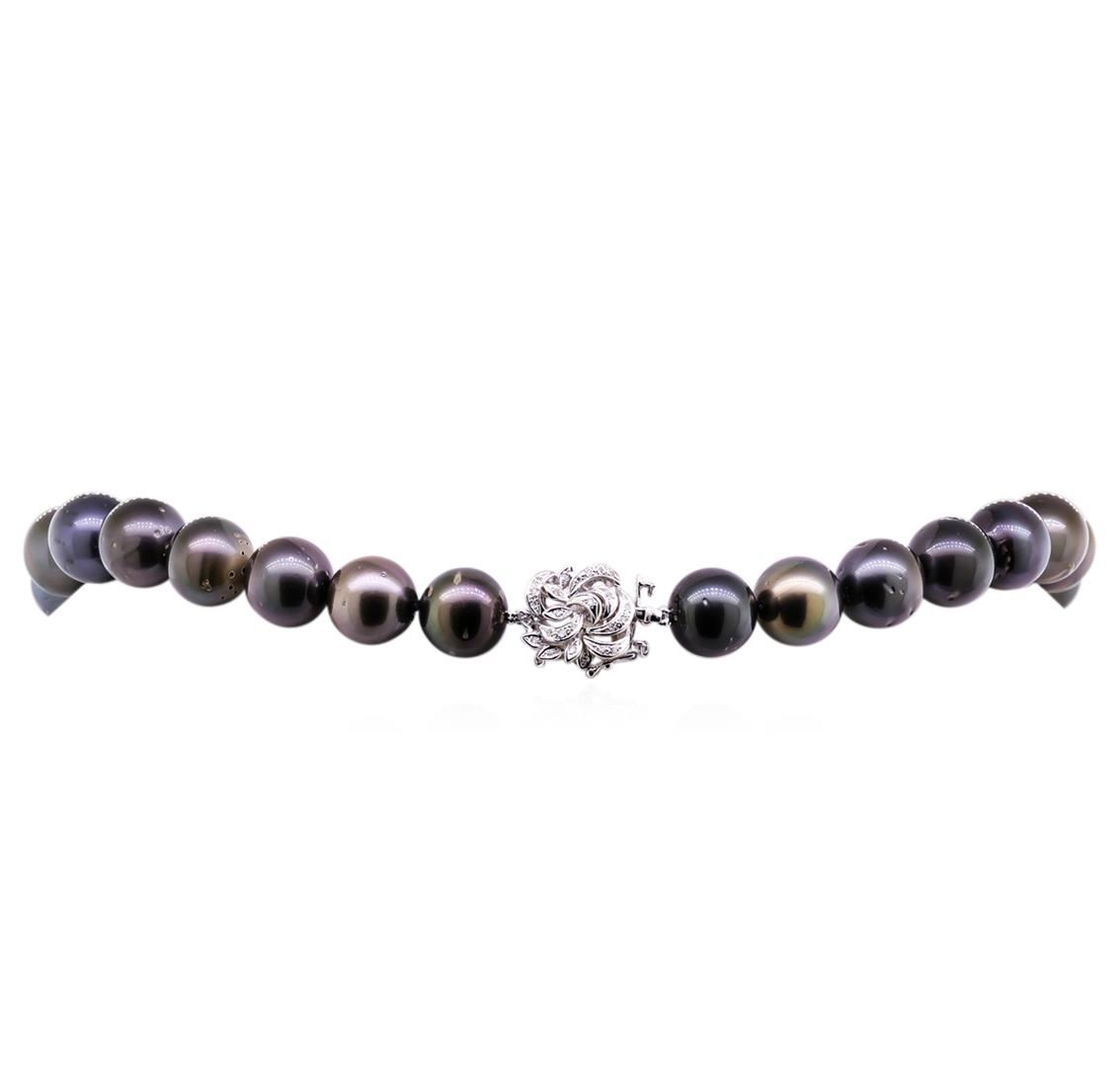 One graduated single strand pearl necklace 18.0" princess length, knotted with a tongue clasp & foldover safety containing 29 Tahitian pearls, 13.0mm in size to 16.7mm in size. The pearls are black in color, green overtone with a good luster, round to near round, and moderately blemished with very good matching. Graded on the strand. Tahitian cultured pearls form in the Pinctada Margaritifera oysters. This species is native to the central and South Pacific Ocean but is generally raised in lagoons by pearl farmers. Tahitian cultured pearls take between two to four years to form. Forty-Five prong set single cut diamonds, measuring 1.00 - 0.90 x 0.59mm (depth est.) approximate total weight of 45 Stones = 0.15ct. Graded in the setting. Clarity: VS-2 to SI-1. Color: G - Good. Total Weight of Diamonds 0.15ct. Total Weight of 129.00gm. GAS Appraised at $38,405.00.