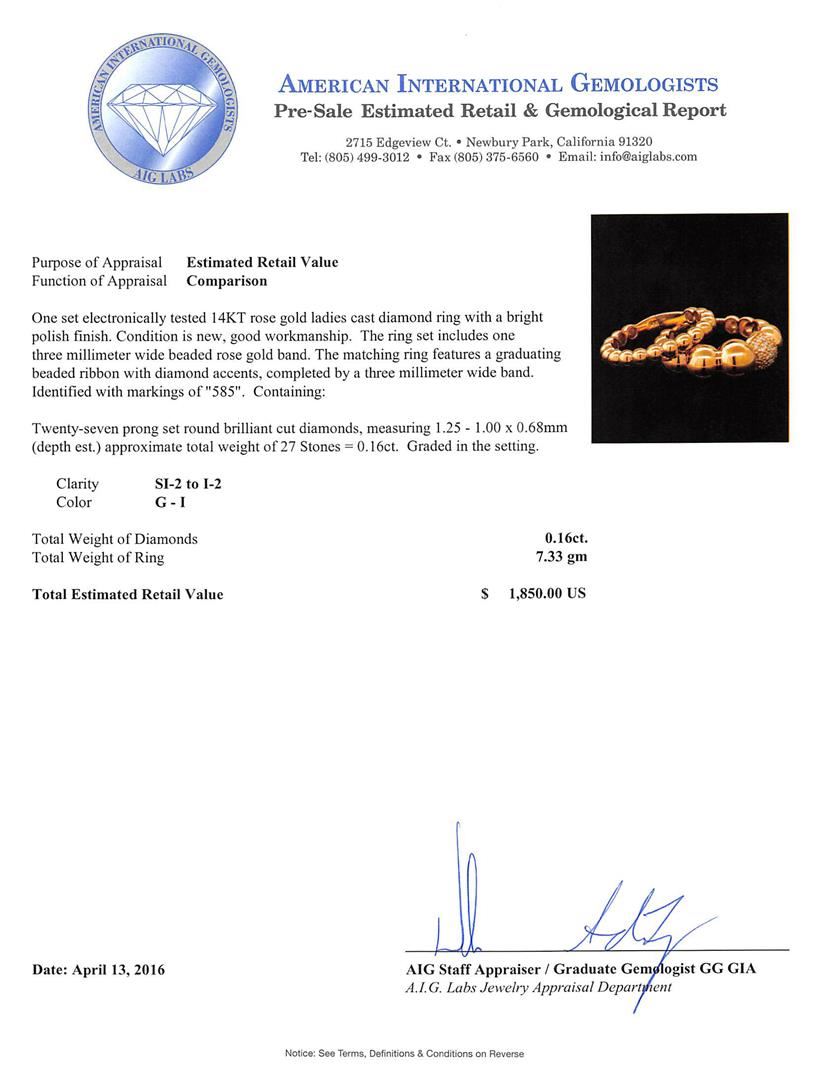 One set electronically tested 14KT rose gold ladies cast diamond ring with a bright polish finish. The ring set includes one three millimeter wide beaded rose gold band. The matching ring features a graduating beaded ribbon with diamond accents, completed by a three millimeter wide band. Identified with markings of "585". Condition is new, good workmanship. Containing: Twenty-Seven prong set round brilliant cut diamonds, measuring 1.25 - 1.00 x 0.68mm (depth est.) approximate total weight of 27 Stones = 0.16ct. Graded in the setting. Clarity: SI-2 to I-2. Color: G - I. Total Weight of Diamonds 0.16ct. Total Weight of Ring 7.33gm. AIG Appraised.