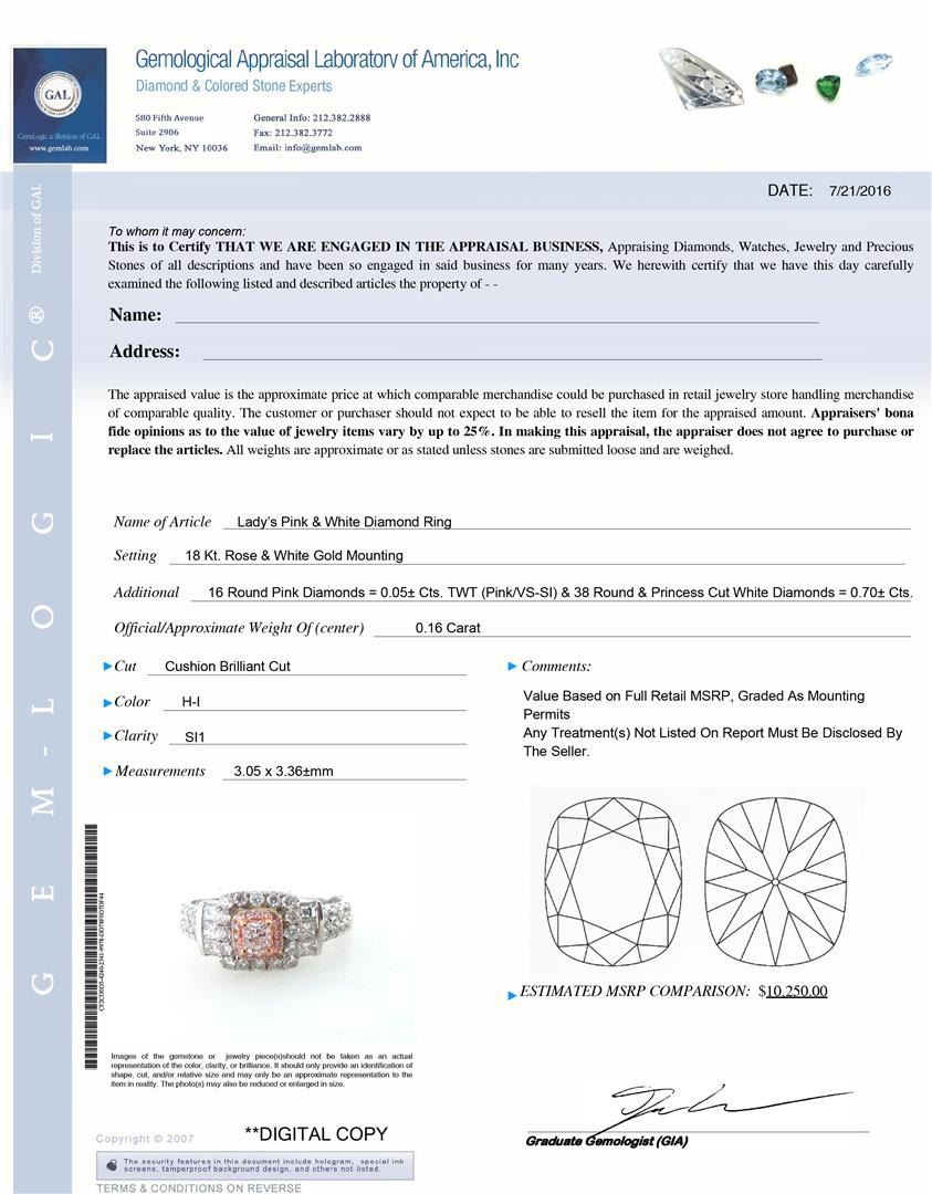 One Lady's Pink and White Diamond Ring. Setting: 18 Kt. Rose and White Gold Mounting. Additional: 16 Round Pink Diamonds = 0.05 Cts. TWT (Pink/VS-SI) and 38 Round and Princess Cut White Diamonds = 0.70 Cts. Center Gem Stone Information: Weight: 0.16 Carats. Cut: Cushion Brilliant Cut. Color: H-I. Clarity: SI1. Measurements: 3.05 x 3.36 mm. Total Weight: 4.33 grams.