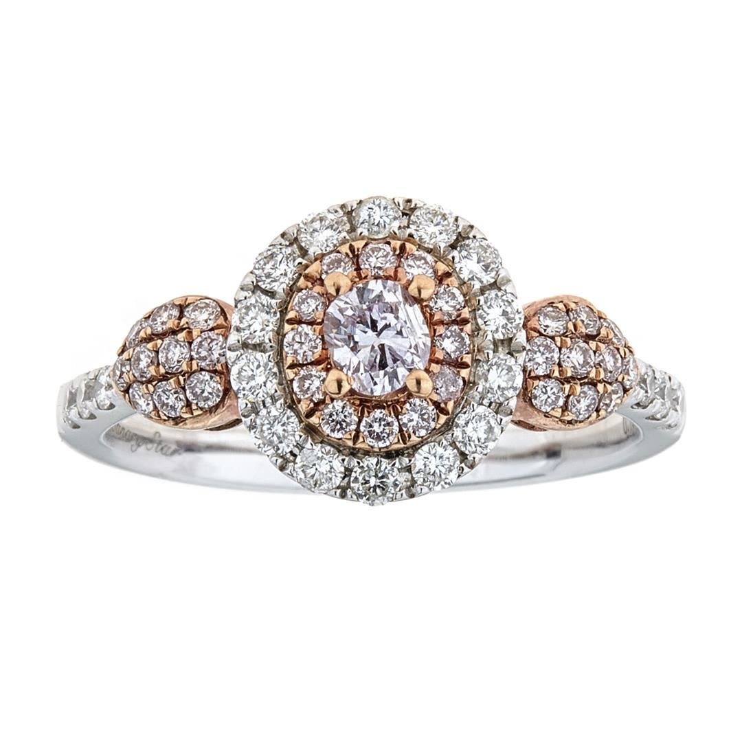 One Lady's Pink and White Diamond Ring. Setting: 18 Kt. Rose and White Gold Mounting. Additional: 32 Round Pink Diamonds = 0.25 Cts. TWT (Pink/VS-SI) and 20 Round White Diamonds = 0.35 Cts. TWT (G-H/VS). Center Gem Stone Information: Weight: 0.16 Carats. Cut: Oval Brilliant Cut. Color: Light Pink. Clarity: SI2. Measurements: 3.70 x 3.35 mm. Total Weight: 4.17 grams.