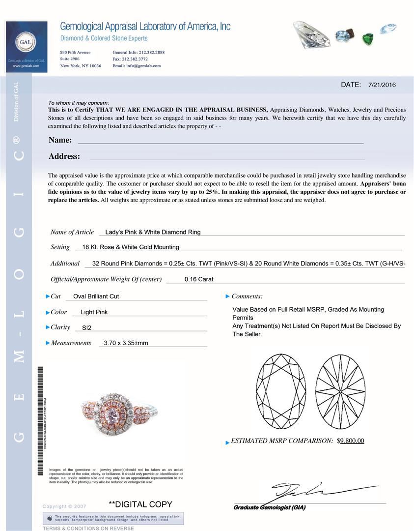 One Lady's Pink and White Diamond Ring. Setting: 18 Kt. Rose and White Gold Mounting. Additional: 32 Round Pink Diamonds = 0.25 Cts. TWT (Pink/VS-SI) and 20 Round White Diamonds = 0.35 Cts. TWT (G-H/VS). Center Gem Stone Information: Weight: 0.16 Carats. Cut: Oval Brilliant Cut. Color: Light Pink. Clarity: SI2. Measurements: 3.70 x 3.35 mm. Total Weight: 4.17 grams.