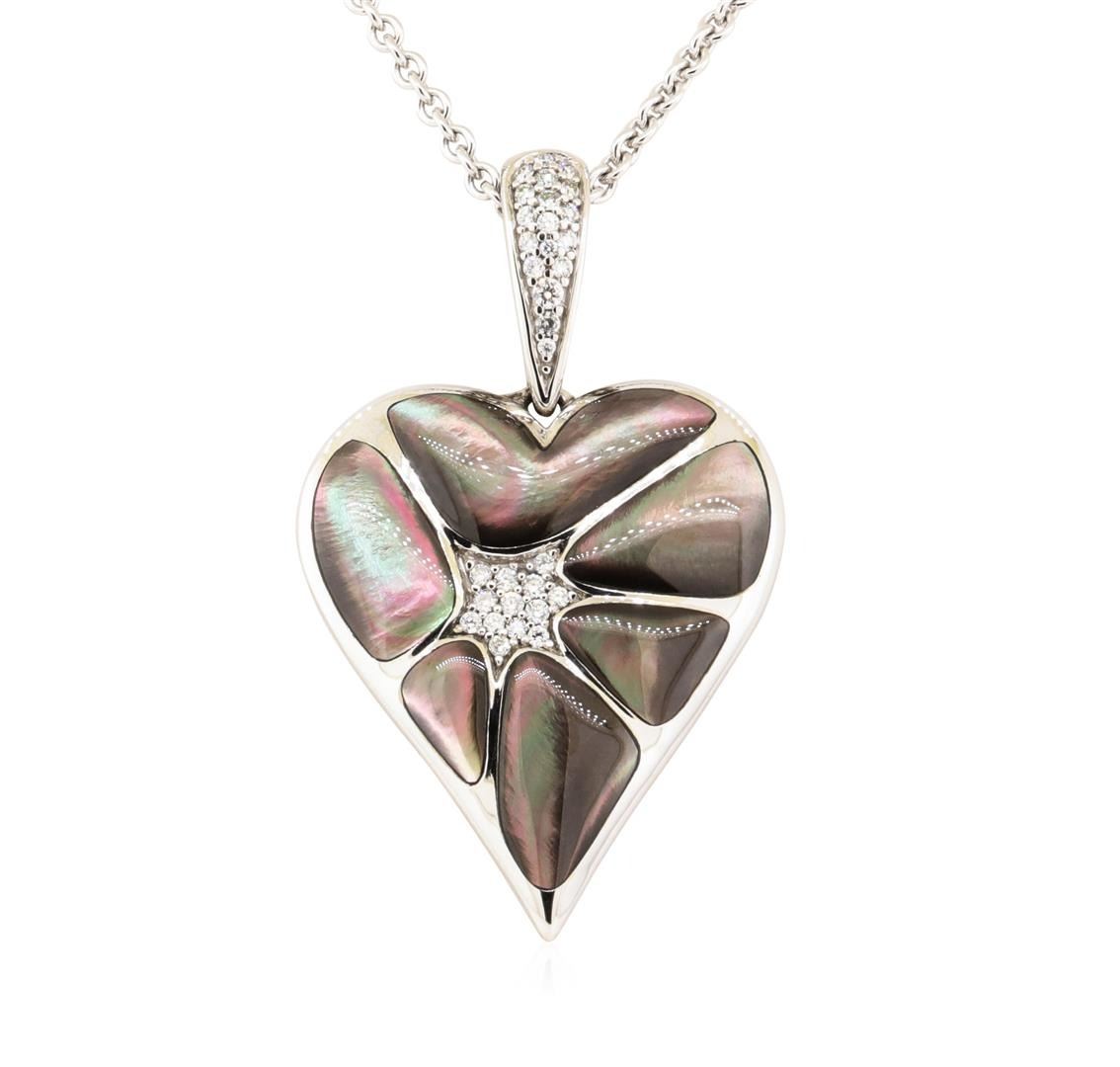 One electronically tested 14KT white gold lady's combination cast & assembled fashion heart shape pendant and chain 18.0' long, 1.9mm round cable link with a lobster claw clasp with a bright polish finish. The featured lady's pendant contains six inlaid pieces of black mother of pearl. Trademark is KABANA. Identified with markings of '14K'. Condition is new, good workmanship. Containing: One prong set round brilliant cut diamond, measuring 1.65 - 1.60 x 1.01mm (depth est.) approximate weight of 0.02ct. Graded in the setting. Color G - H Clarity VS-2 Cut Very Good Thirty prong set round brilliant cut diamonds, measuring 1.20 - 1.00 x 0.68mm (depth est.) approximate total weight of 30 Stones = 0.15ct. Graded in the setting. Color G - H Clarity VS-1 to VS-2 Cut Very Good. Total Weight of Diamonds 0.17ct.. Total Weight of Pendant And Chain 19.30gm GAS Appraised at $3200.00. GAS Appraised.