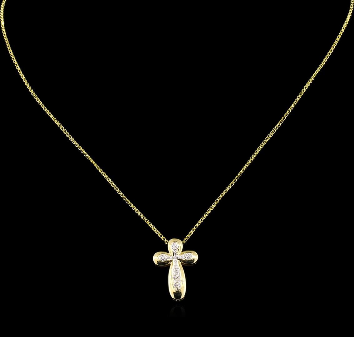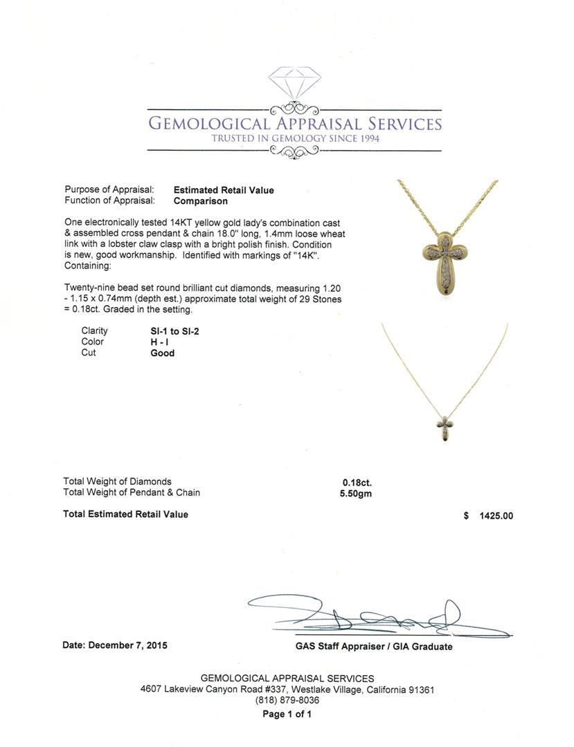 One electronically tested 14KT yellow gold lady's combination cast & assembled cross pendant & chain 18.0" long, 1.4mm loose wheat link with a lobster claw clasp with a bright polish finish. Identified with markings of "14K". Condition is new, good workmanship. Containing: Twenty-Nine bead set round brilliant cut diamonds, measuring 1.20 - 1.15 x 0.74mm (depth est.) approximate total weight of 29 Stones = 0.18ct. Graded in the setting. Clarity: SI-1 to SI-2. Color: H - I. Cut Good. Total Weight of Diamonds 0.18ct. Total Weight of Pendant & Chain 5.50gm. GAS Appraised at $1,425.00.