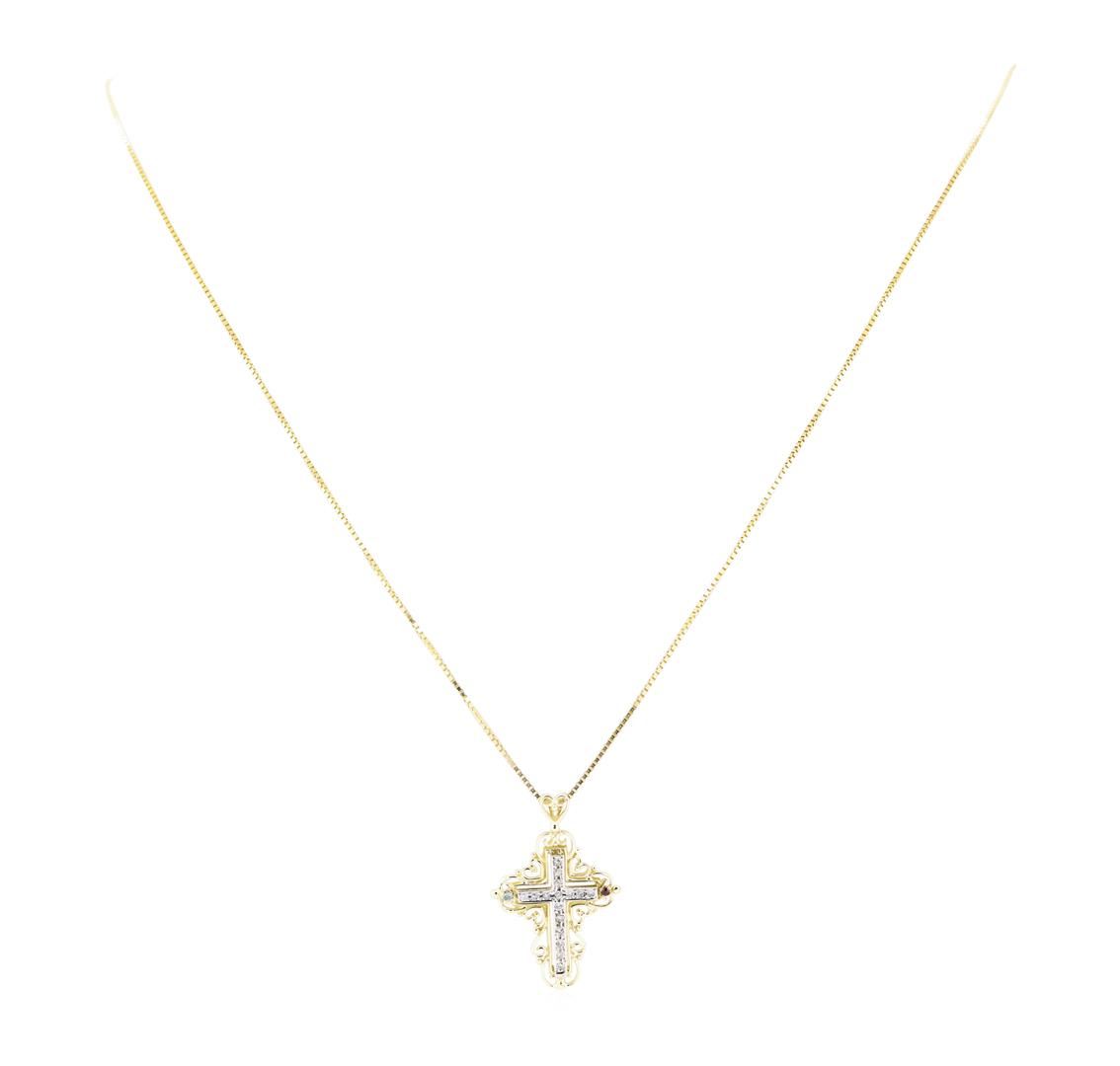 One cross pendant with a filigree scroll motif with an attached thirty inch long box chain featuring: 14KT yellow and white gold weighing 9.5 grams containing diamonds weighing 0.18ctw.