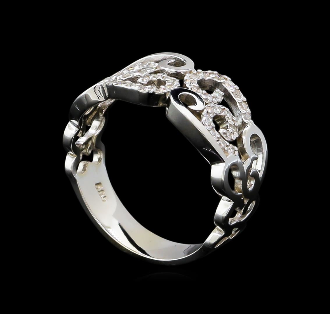 One electronically tested 14KT white gold ladies cast diamond ring with a bright polish finish. The ring features a diamond accented filigree cut-out design supported by tapering shoulders, completed by a four millimeter wide band. Identified with markings of "585". Condition is new, good workmanship. Containing: Forty prong set round brilliant cut diamonds, measuring 1.10 - 1.00 x 0.63mm (depth est.) approximate total weight of 40 Stones = 0.19ct. Graded in the setting. Clarity: I-1 to I-2. Color: G - I. Total Weight of Diamonds 0.19ct. Total Weight of Ring 3.85gm. AIG Appraised at $1,325.00.