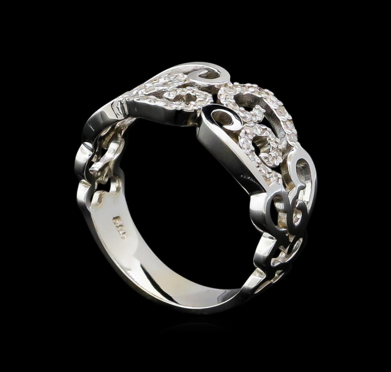 One electronically tested 14KT white gold ladies cast diamond ring with a bright polish finish. The ring features a diamond accented filigree cut-out design supported by tapering shoulders, completed by a four millimeter wide band. Identified with markings of "585". Condition is new, good workmanship. Containing: Forty prong set round brilliant cut diamonds, measuring 1.10 - 1.00 x 0.63mm (depth est.) approximate total weight of 40 Stones = 0.19ct. Graded in the setting. Clarity: I-1 to I-2. Color: G - I. Total Weight of Diamonds 0.19ct. Total Weight of Ring 3.85gm. AIG Appraised.
