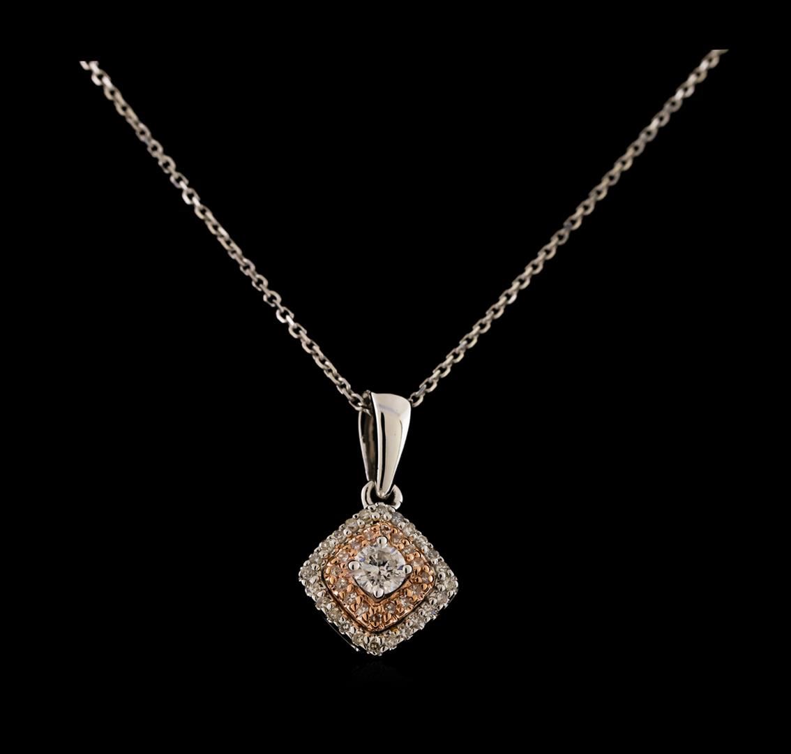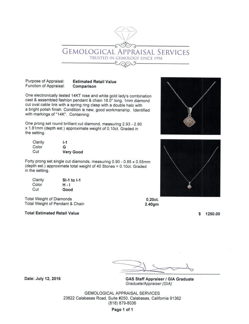 One electronically tested 14KT rose and white gold lady's combination cast & assembled fashion pendant & chain 18.0' long, 1mm diamond cut oval cable link with a spring ring clasp with a double halo with a bright polish finish. Identified with markings of '14K'. Condition is new, good workmanship. Containing: One prong set round brilliant cut diamond, measuring 2.93 - 2.90 x 1.81mm (depth est.) approximate weight of 0.10ct. Graded in the setting. Clarity I-1. Color: G Cut Very Good Forty prong set single cut diamonds, measuring 0.90 - 0.85 x 0.55mm (depth est.) approximate total weight of 40 Stones = 0.10ct. Graded in the setting. Clarity SI-1 to I-1. Color: H - I Cut Good. Total Weight of Diamonds 0.20ct.. Total Weight of Pendant & Chain 2.40gm. GAS Appraised at $1,250.00.