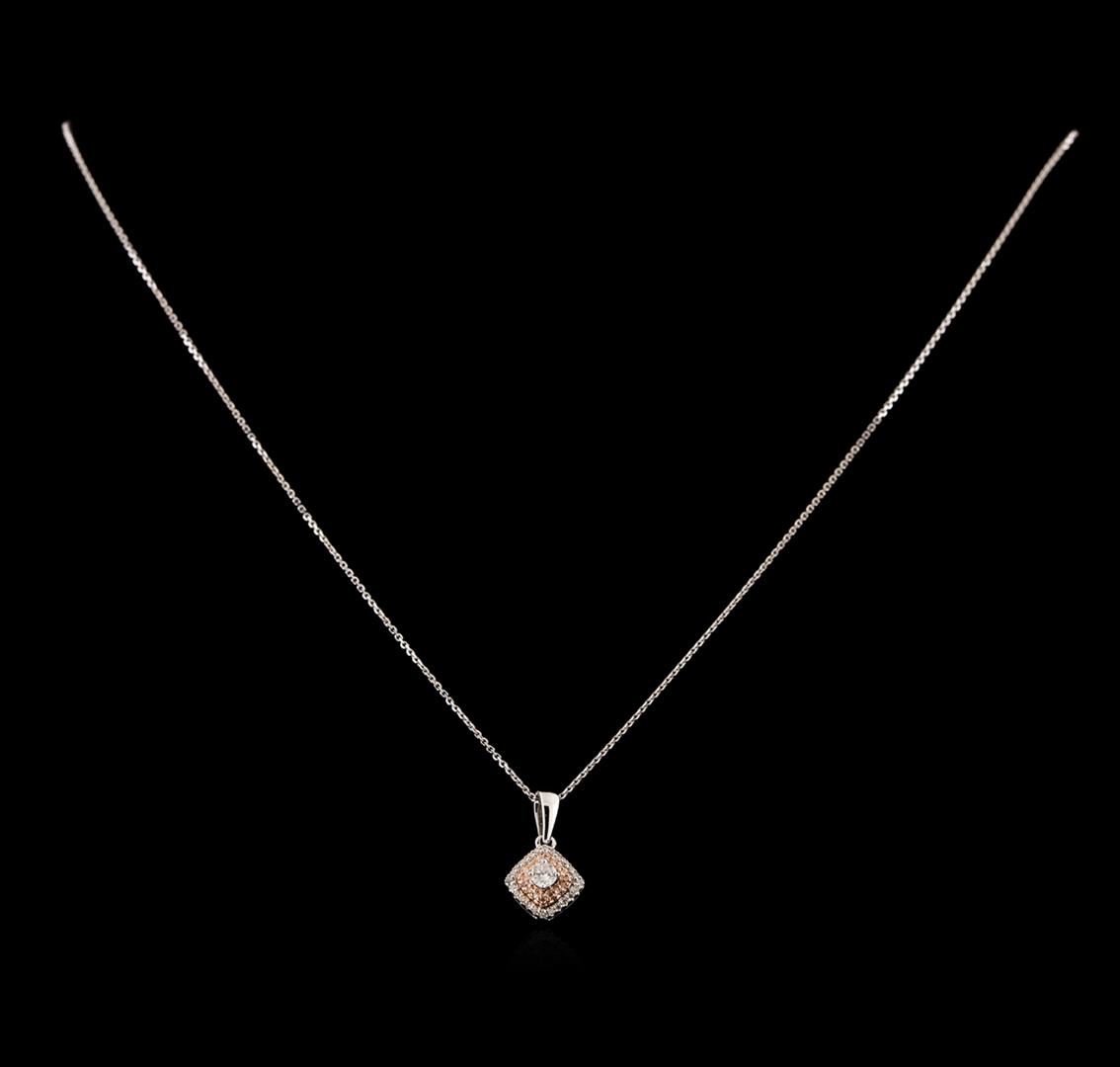 One electronically tested 14KT rose and white gold lady's combination cast & assembled fashion pendant & chain 18.0' long, 1mm diamond cut oval cable link with a spring ring clasp with a double halo with a bright polish finish. Identified with markings of '14K'. Condition is new, good workmanship. Containing: One prong set round brilliant cut diamond, measuring 2.93 - 2.90 x 1.81mm (depth est.) approximate weight of 0.10ct. Graded in the setting. Clarity I-1. Color: G Cut Very Good Forty prong set single cut diamonds, measuring 0.90 - 0.85 x 0.55mm (depth est.) approximate total weight of 40 Stones = 0.10ct. Graded in the setting. Clarity SI-1 to I-1. Color: H - I Cut Good. Total Weight of Diamonds 0.20ct.. Total Weight of Pendant & Chain 2.40gm. GAS Appraised at $1,250.00.