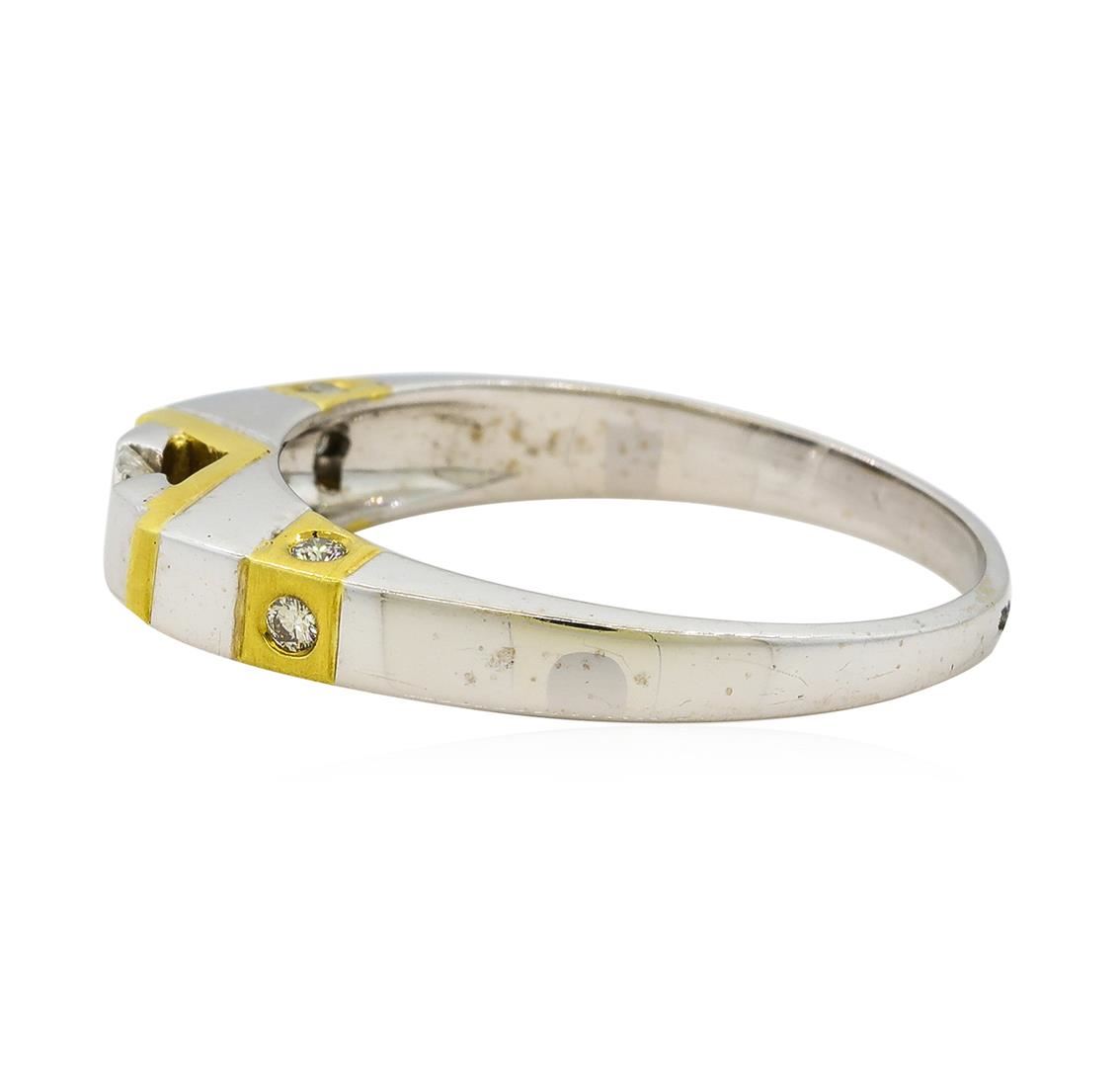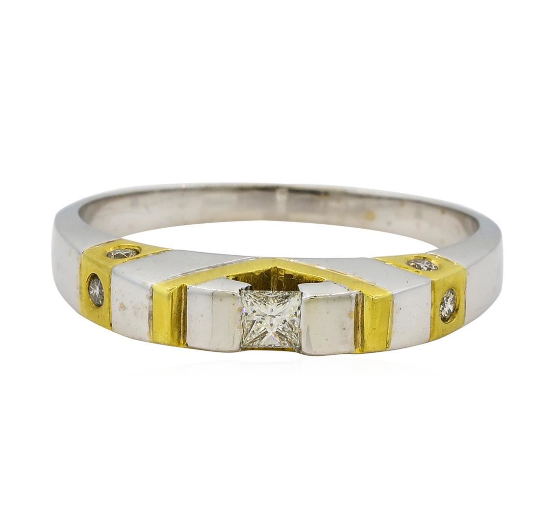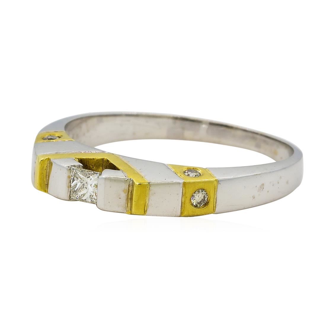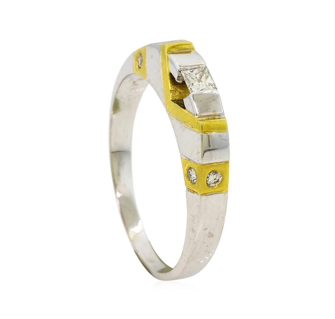 One electronically tested 18KT white gold cast diamond ring. The featured diamond is set cathedral set with mirroring diamond accents on either side, completed by a one and one-half millimeter wide band. Bright polish finish with yellow gold overlay. Identified with markings of '750'. Condition is good. Containing: One tension set princess cut diamond, measuring 2.70 x 2.60 x 1.95mm (depth est.) approximate weight of 0.12ct. Graded in the setting. Clarity VS-1. Color: H Depth 75.0%. Table: 84.6%. Six flush set round brilliant cut diamonds, measuring 1.50 - 1.50 x 0.90mm (depth est.) approximate total weight of 6 Stones = 0.08ct. The clarity grade reflects the entire range of clarity for this group. Graded in the setting. Clarity SI-1 to I-2. Color: G - I. Total Weight of Diamonds 0.20ct.. Total Weight of Ring 3.98gm. AIG Appraised at $1,560.00.