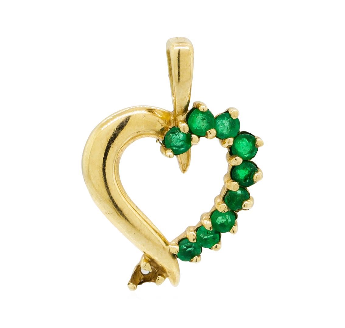 One lady's heart shaped pendant featuring: 14KT yellow gold weighing 0.8 grams containing emeralds weighing 0.20ctw.