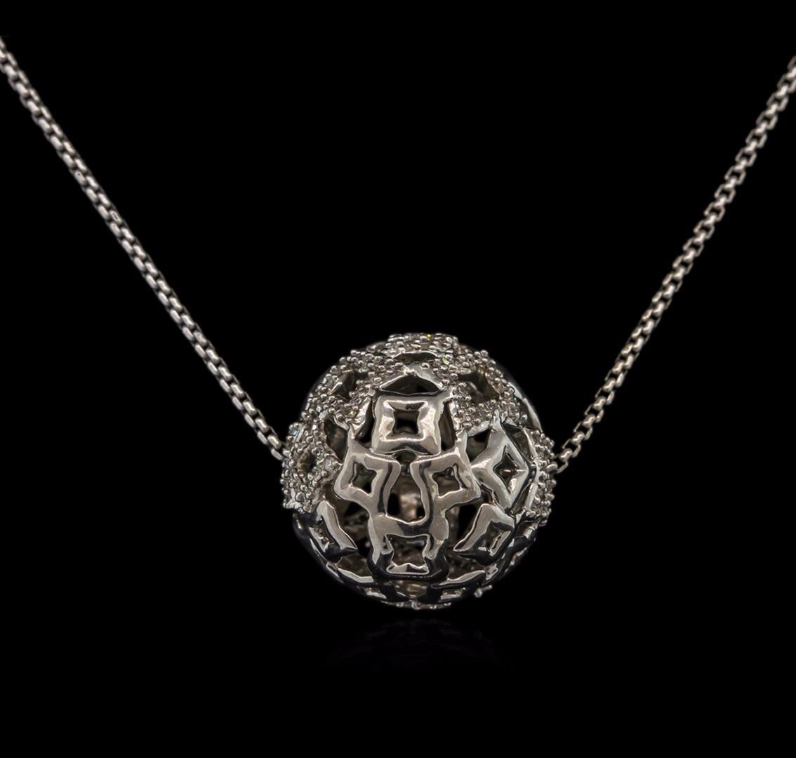 One ball pendant with chain featuring: silver weighing 9.01 grams containing prong set round diamonds with a total weight of 0.20ct.