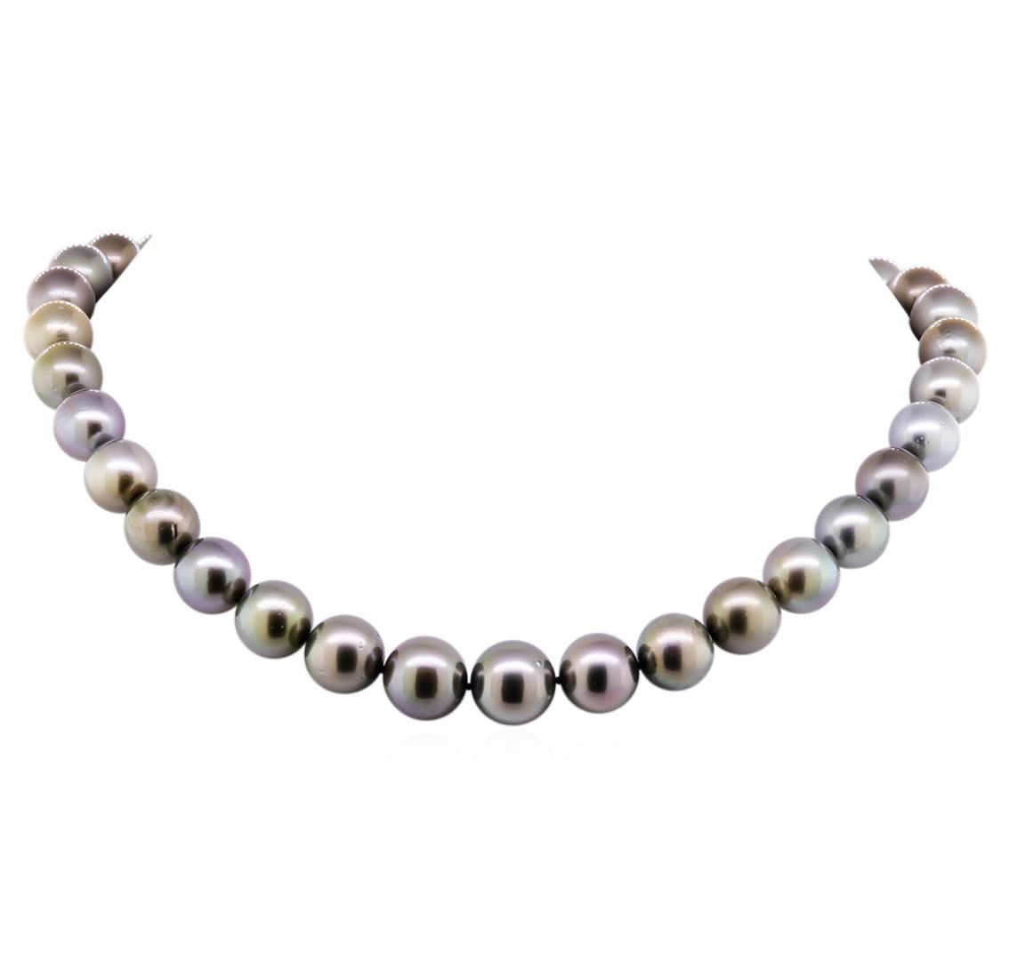 One graduated single strand pearl necklace 18.0" princess length, knotted with a tongue clasp & foldover safety containing 35 Tahitian pearls, 11.0mm in size to 14.1mm in size. The pearls are silver in color, green overtone with a good luster, round to near round, and lightly blemished with very good matching. Graded on the strand. Tahitian cultured pearls form in the Pinctada Margaritifera oysters. This species is native to the central and South Pacific Ocean but is generally raised in lagoons by pearl farmers. Tahitian cultured pearls take between two to four years to form. Thirty-Seven prong set single cut diamonds, measuring 1.20 - 1.10 x 0.69mm (depth est.) approximate total weight of 37 Stones = 0.20ct. Graded in the setting. Clarity: SI-1 to I-1. Color: G - Good. Total Weight of Diamonds 0.20ct. Total Weight of 95.80gm. GAS Appraised at $19,465.00.