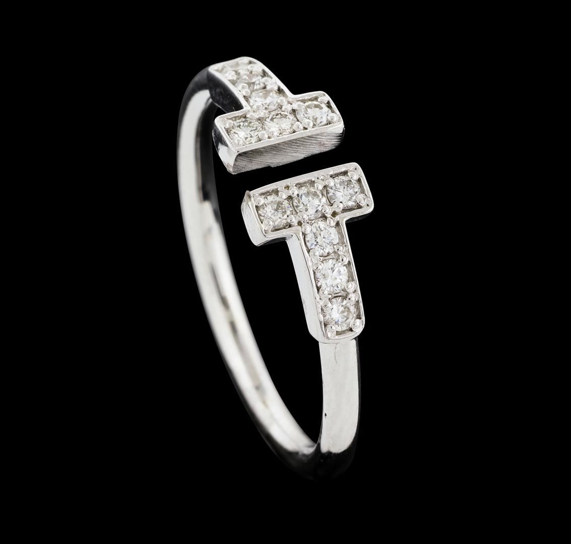 One electronically tested 14KT white gold lady's cast fashion ring with a bright polish finish. The featured lady's ring has double 'T' with negative space motif at the top of the ring and a shank measuring 1.68 millimeters wide. Identified with markings of '14K'. Condition is new, good workmanship. Containing: Twelve prong set round brilliant cut diamonds, measuring 1.70 - 1.65 x 1.02mm (depth est.) approximate total weight of 12 Stones = 0.21ct. Graded in the setting. Clarity SI-1 to SI-2. Color: H - I Cut Good. Total Weight of Diamonds 0.21ct.. Total Weight of Ring 2.30gm. GAS Appraised at $895.00.