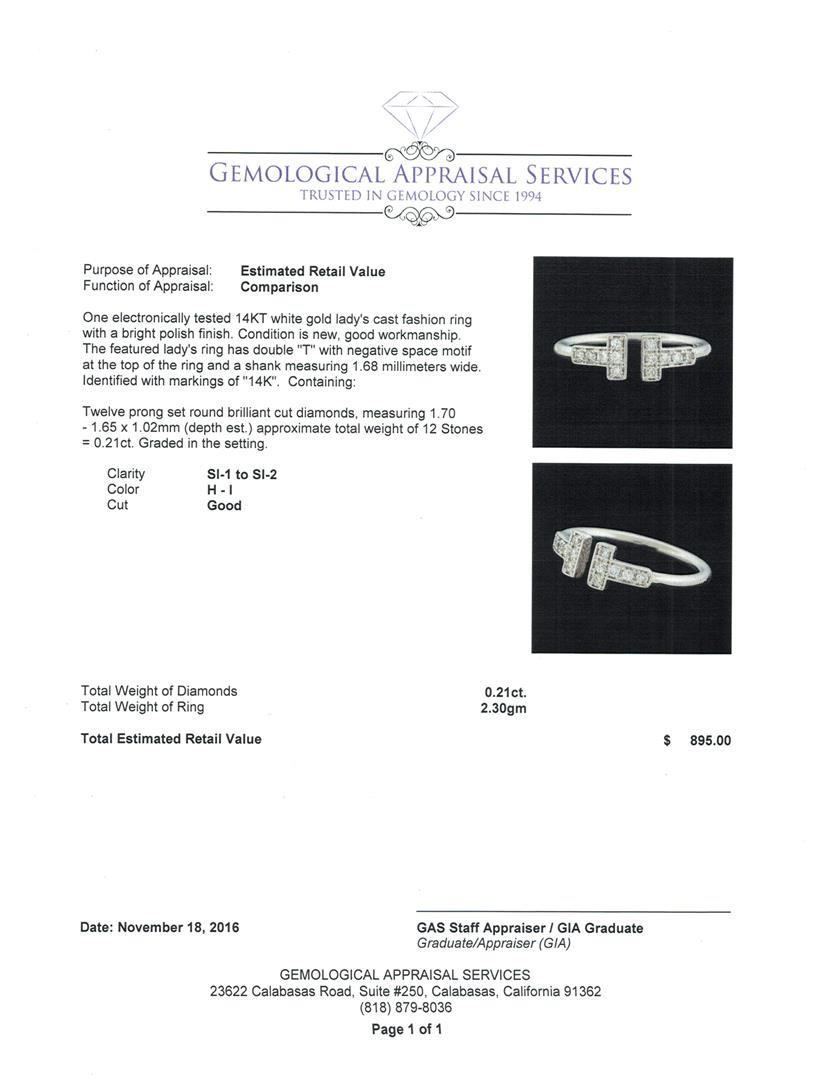 One electronically tested 14KT white gold lady's cast fashion ring with a bright polish finish. The featured lady's ring has double 'T' with negative space motif at the top of the ring and a shank measuring 1.68 millimeters wide. Identified with markings of '14K'. Condition is new, good workmanship. Containing: Twelve prong set round brilliant cut diamonds, measuring 1.70 - 1.65 x 1.02mm (depth est.) approximate total weight of 12 Stones = 0.21ct. Graded in the setting. Clarity SI-1 to SI-2. Color: H - I Cut Good. Total Weight of Diamonds 0.21ct.. Total Weight of Ring 2.30gm. GAS Appraised at $895.00.