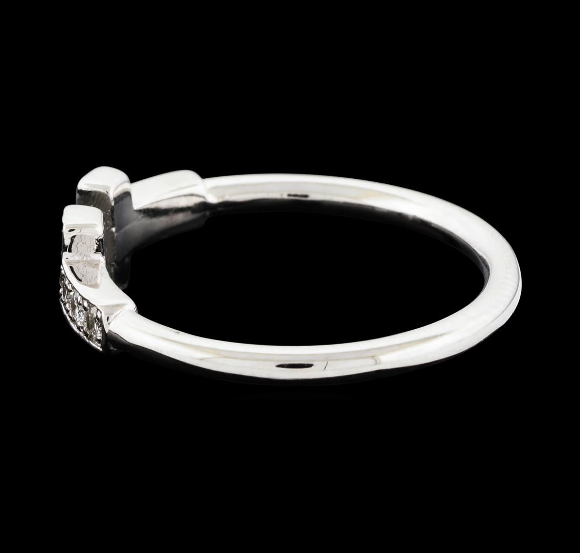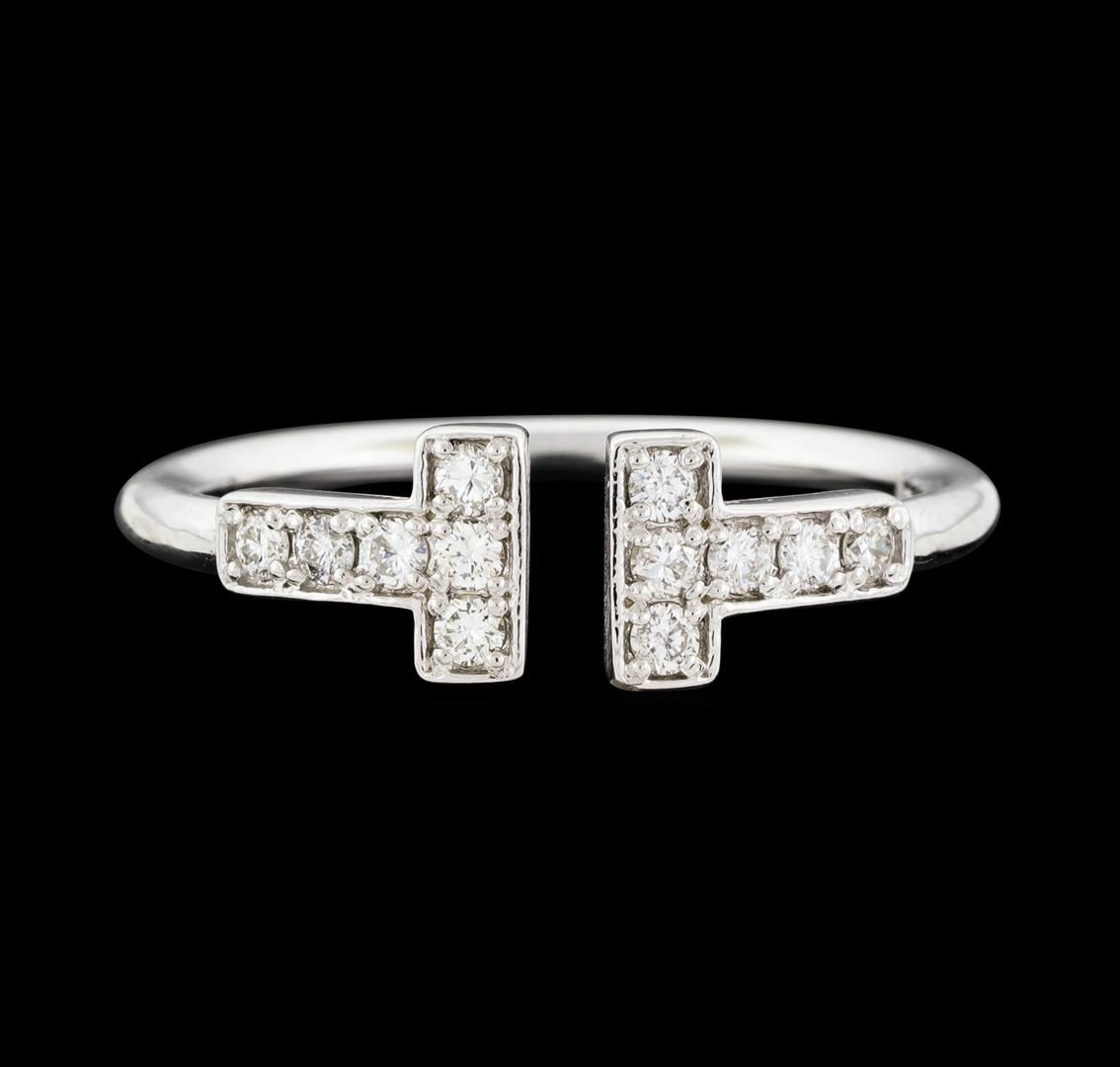 One electronically tested 14KT white gold lady's cast fashion ring with a bright polish finish. The featured lady's ring has double 'T' with negative space motif at the top of the ring and a shank measuring 1.68 millimeters wide. Identified with markings of '14K'. Condition is new, good workmanship. Containing: Twelve prong set round brilliant cut diamonds, measuring 1.70 - 1.65 x 1.02mm (depth est.) approximate total weight of 12 Stones = 0.21ct. Graded in the setting. Clarity SI-1 to SI-2. Color: H - I Cut Good. Total Weight of Diamonds 0.21ct.. Total Weight of Ring 2.30gm. GAS Appraised at $895.00.