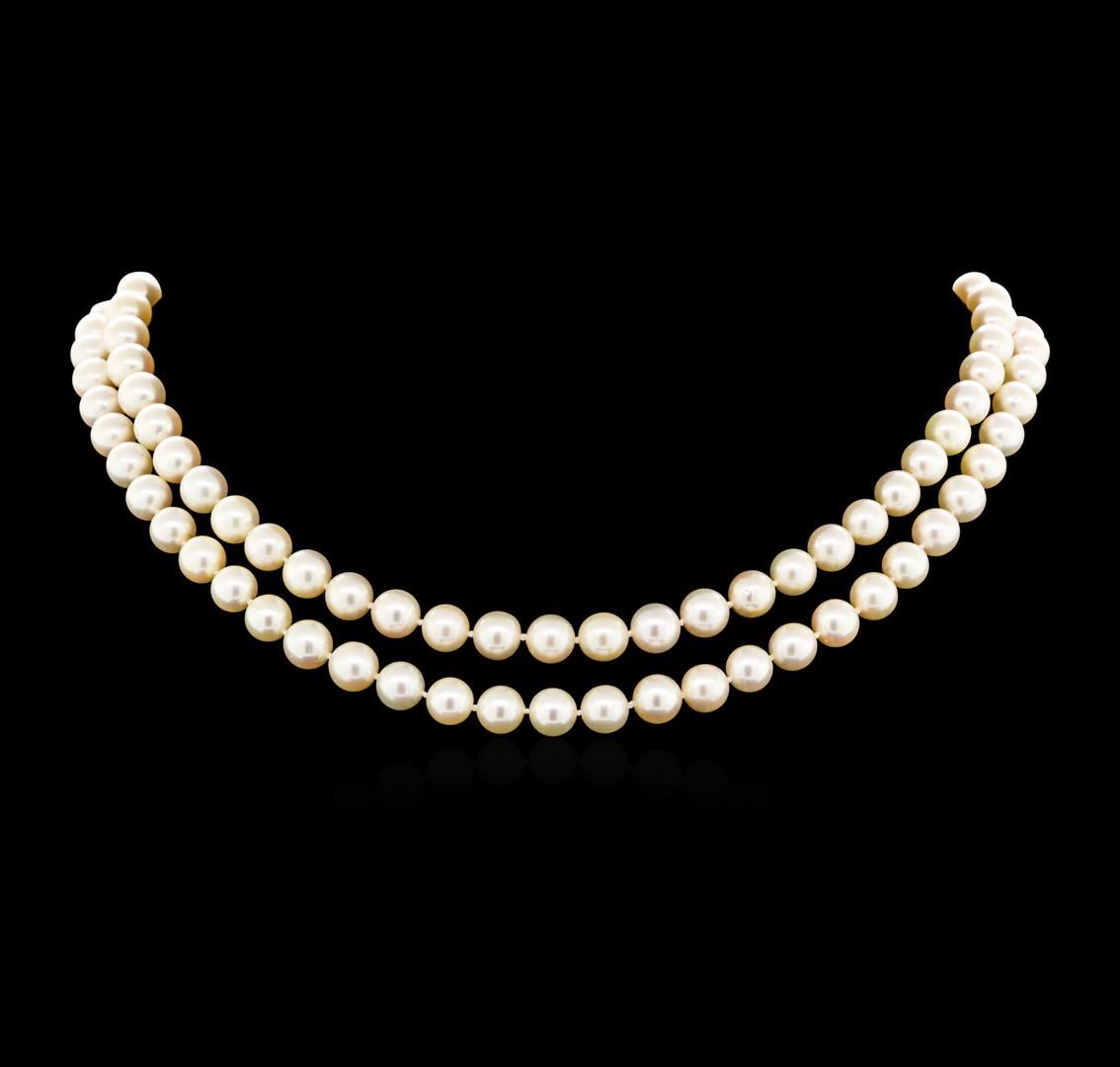 One uniform single strand pearl necklace 36.0' opera length, knotted with a fish hook clasp containing 108 akoya cultured pearls, 8.0mm to 7.5mm in size. The pearls are pink in color, ros� overtone with a very good luster, round, and clean with very good matching. Graded on the strand. Eighteen prong set round brilliant cut diamonds, measuring 1.50 - 1.40 x 0.90mm (depth est.) approximate total weight of 18 Stones = 0.21ct. Graded in the setting. Color H - I Clarity SI-2 to I-1 Cut Good. Total Weight of Diamonds 0.21ct.. Total Weight of 74.70gm GAS Appraised at $8535.00. GAS Appraised at $8,535.00.