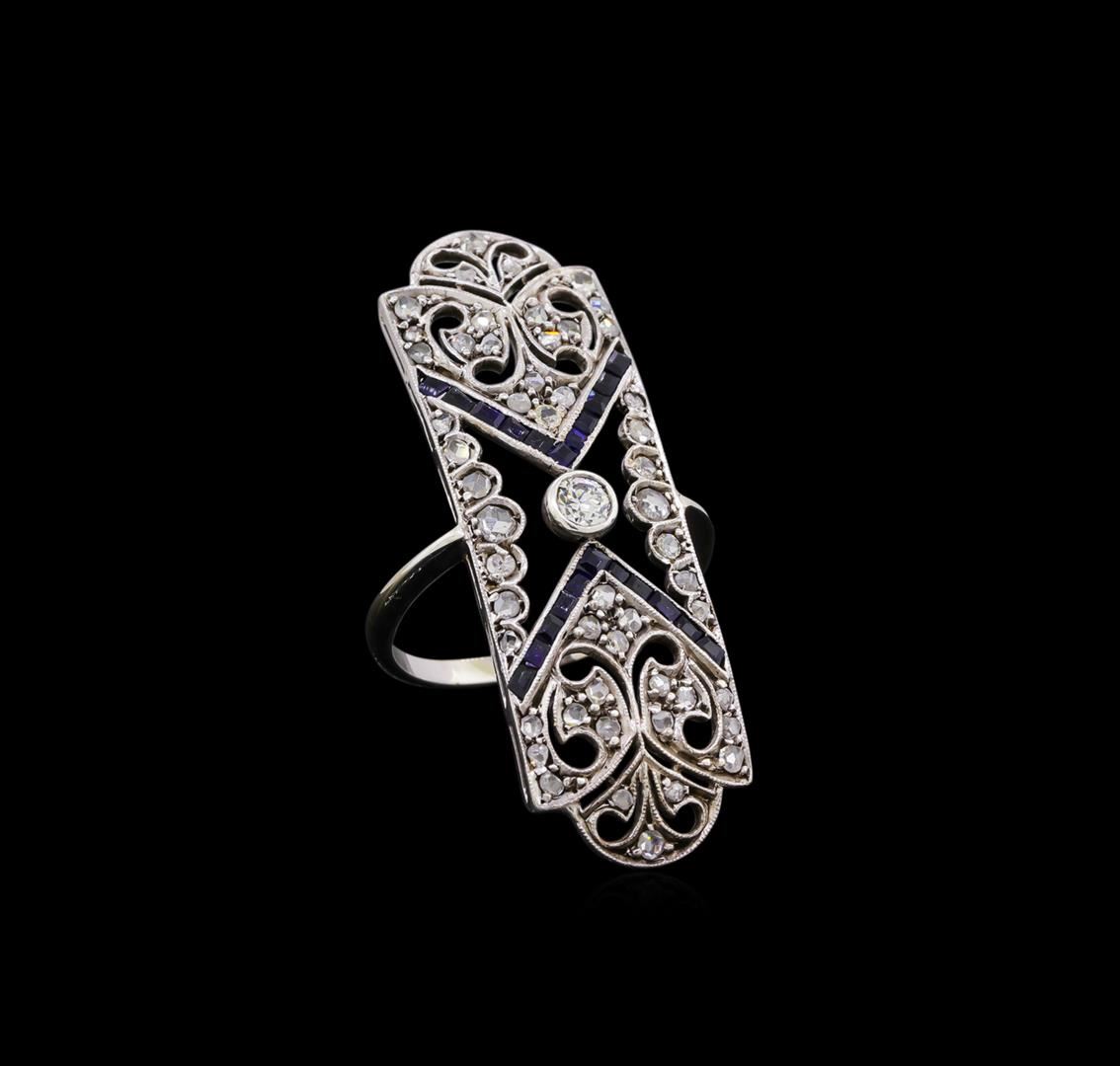 One electronically tested 14KT white gold ladies cast sapphire and diamond ring. The ring features a center diamond set within an elongated diamond set cut-out gallery with sapphire ribbon accents, completed by a one millimeter wide band. Bright polish finish with milgrain detailing. Condition is good. Containing: One bezel set transitional cut diamond, measuring 3.10 - 3.10 x 1.90mm (depth est.) approximate weight of 0.11ct. Graded in the setting. Clarity: SI-1 . Color: G Fifty-Two prong set round brilliant and rose cut diamonds (depth est.) approximate total weight of 52 Stones = 0.34ct. Graded in the setting. Clarity: SI-2 to I-1 . Color: F - H Twenty-two channel set rectangular step cut blue sapphires, measuring 1.50 x 1.10 x 0.72mm, approximate total weight of 0.22ct., clarity is eye clean, type II, dark, moderately strong, blue color, (GIA B 7/4), cut is good. Transmitting light with no distortion, transparent. The group contains a mix of natural and laboratory created sapphires. Measurements & the color grade are an average for the group. Graded in the setting. Total Weight of Colored Stones 0.22ct.. Total Weight of Diamonds 0.45ct.. Total Weight of Ring 4.09gm. AIG Appraised at $2,190.00.