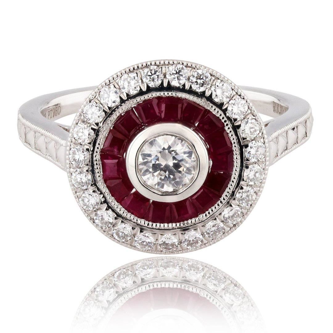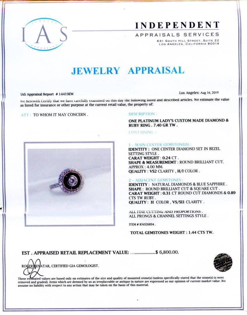 DESCRIPTION: ONE PLATINUM LADY'S CUSTOM MADE DIAMOND & RUBY RING. 7.40 GR TW. 1- MAIN CENTER GEMSTONE(S) IDENTITY : ONE CENTER DIAMOND SET IN BEZEL SETTING STYLE. CARAT WEIGHT : 0.24 CT. SHAPE & MEASUREMEMT : ROUND BRILLIANT CUT. APPROX : 4.00 MM. QUALITY : VS2 CLARITY, H/I COLOR. 2 â€" ADJACENT GEMSTONES : IDENTITY : NATURAL DIAMONDS & BLUE SAPPHIRE. SHAPE : ROUND BRILLIANT CUT & SQUARE CUT. CARAT WEIGHT : 0.31 CTW ROUND CUT DIAMONDS & 0.89 CTS TW RUBY. QUALITY : H COLOR, VS/SI1 CLARITY. ALL FINE CUTTING AND PROPORTIONS. ALL PRONGS & CHANNEL SETTINGS STYLE . TOTAL GEMSTONES WEIGHT : 1.44 CTW TW. Size: 6 3/4
