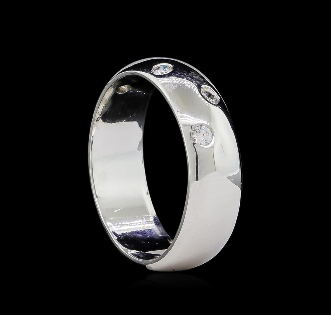 One electronically tested platinum cast diamond ring with a bright polish finish. Six and one-half millimeter wide band features five flush set round brilliant diamonds. Identified with markings of "PT950". Condition is good. Containing: Five flush set round brilliant cut diamonds, measuring 2.20 - 2.10 x 1.29mm (depth est.) approximate total weight of 5 Stones = 0.24ct. Graded in the setting. Clarity: VS-2 to SI-1. Color: G - H. Total Weight of Diamonds 0.24ct. Total Weight of Ring 12.03gm. AIG Appraised at $3,375.00.