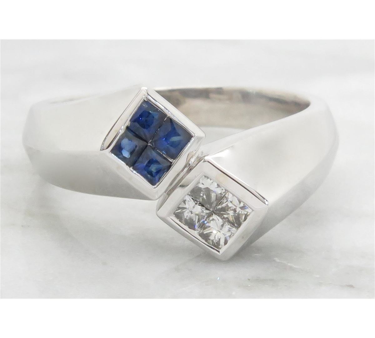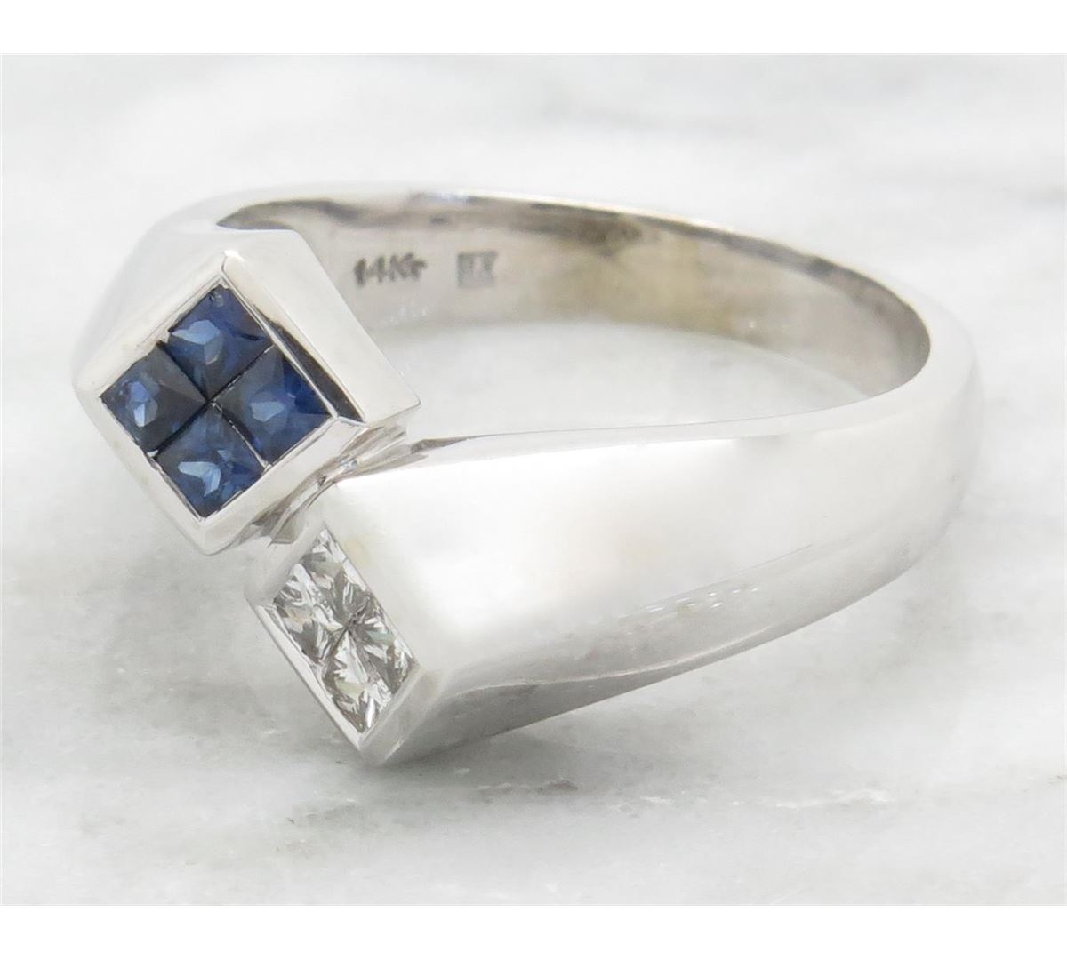 One tested 14K white gold diamond and sapphire ring. Containing: 4 Princess Cut Diamonds. Clarity: I, Color: G-H. 4 Princess Cut blue sapphires. Approximate total diamond weight: .24CTW. Approximate total sapphire weight: .28CTW. All diamonds are graded in the mounting unless otherwise stated. Weight of ring: 5.1 grams, Size: 6.0.