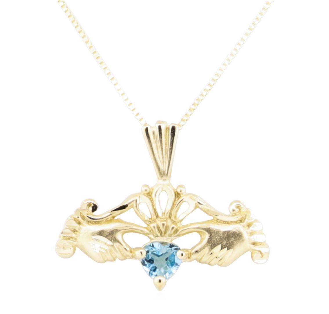 One claddagh pendant with an attached eighteen inch long box chain featuring: 14KT yellow gold weighing 2.5 grams containing one heart shaped blue topaz weighing 0.25ct.